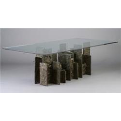 PAUL EVANS for DIRECTIONAL PE 139 sculptured bronze dining table, 1971, with multi-level vertical panels to the base, each with a different textural motif, and 3/4" glass rectangular top. Signed Paul Evans 71. 29 1/4" x 4' x 8' $1,200 - 1,800