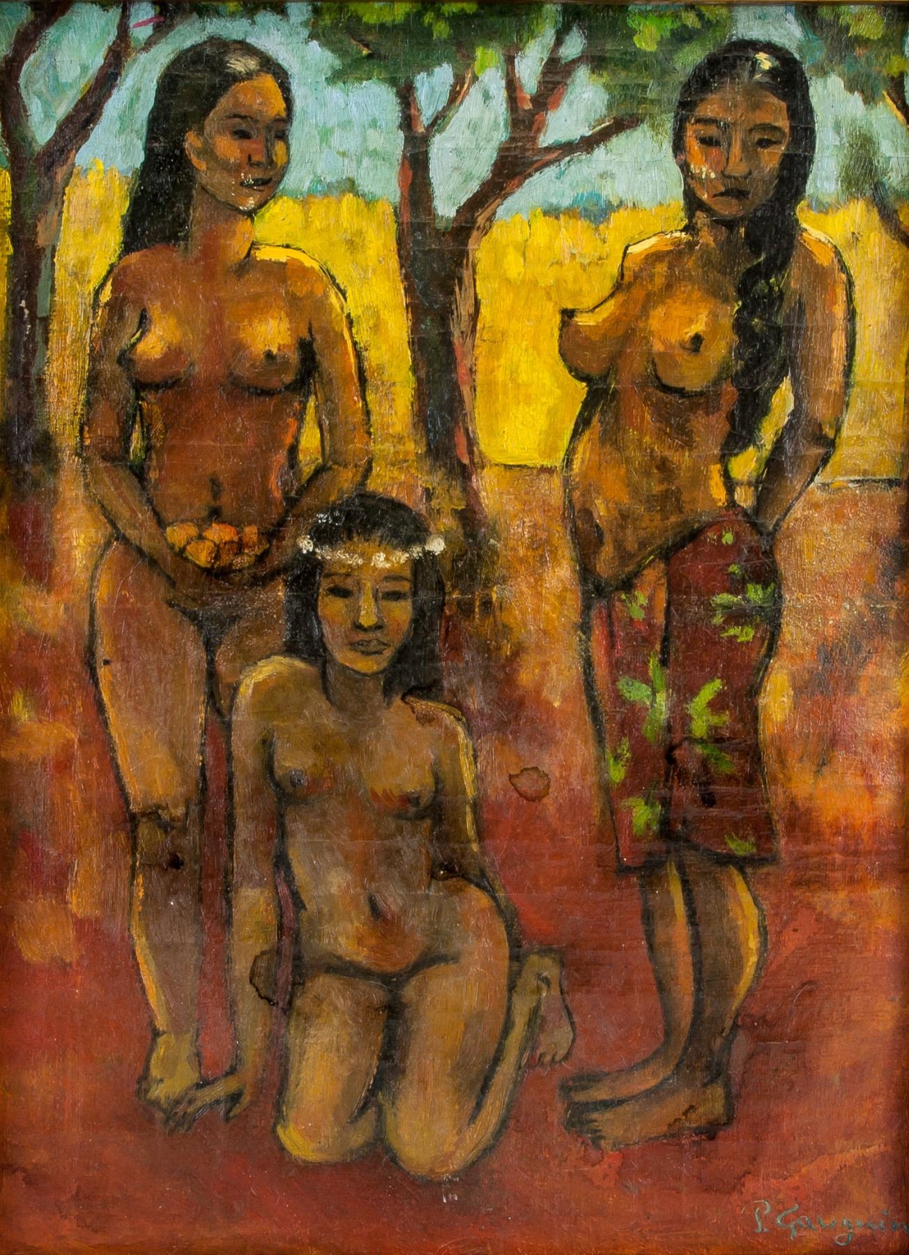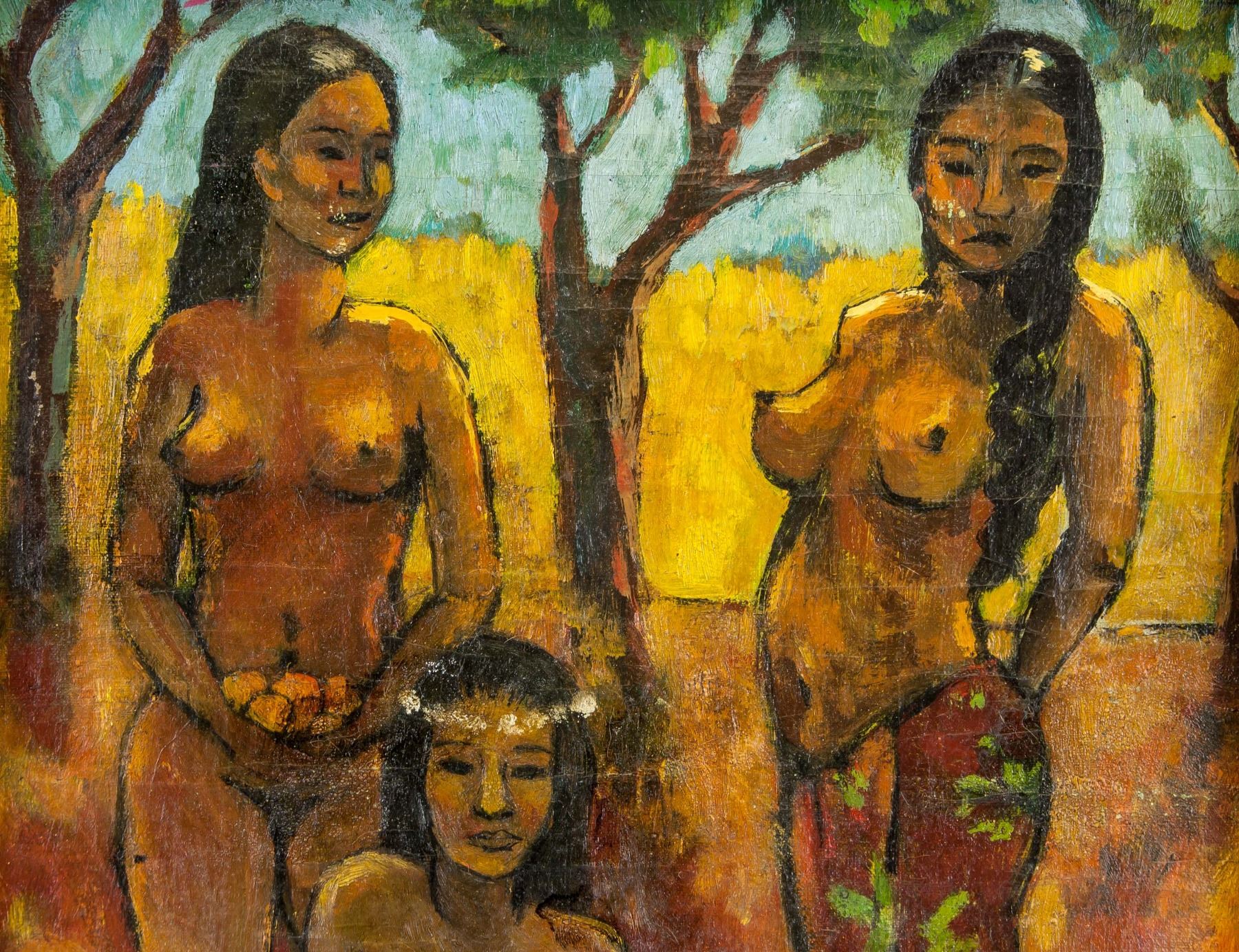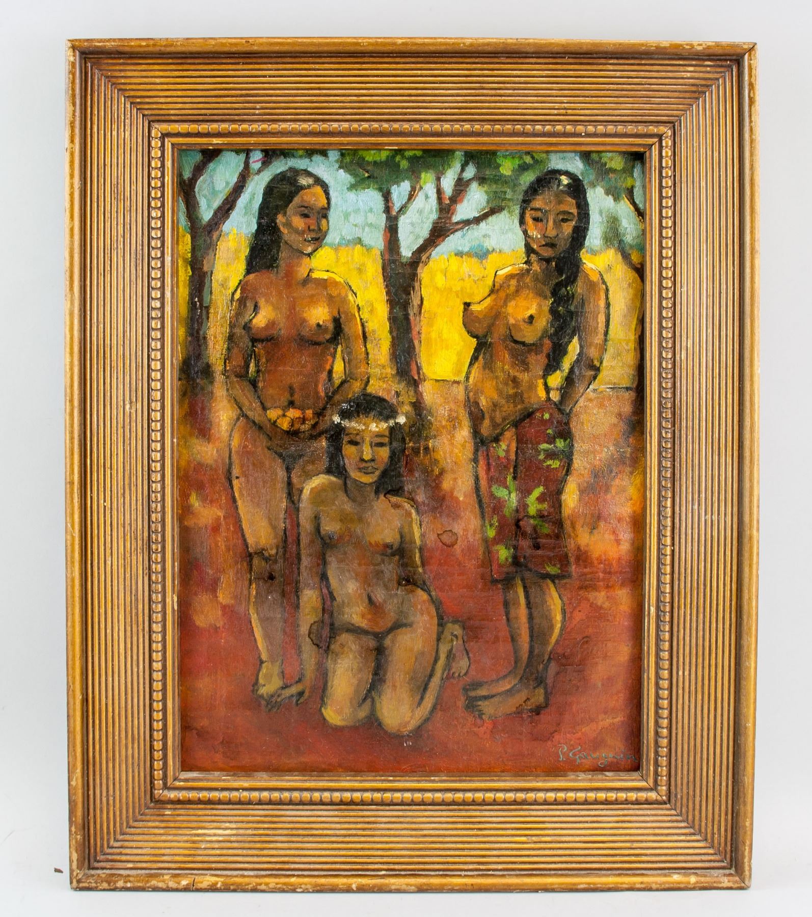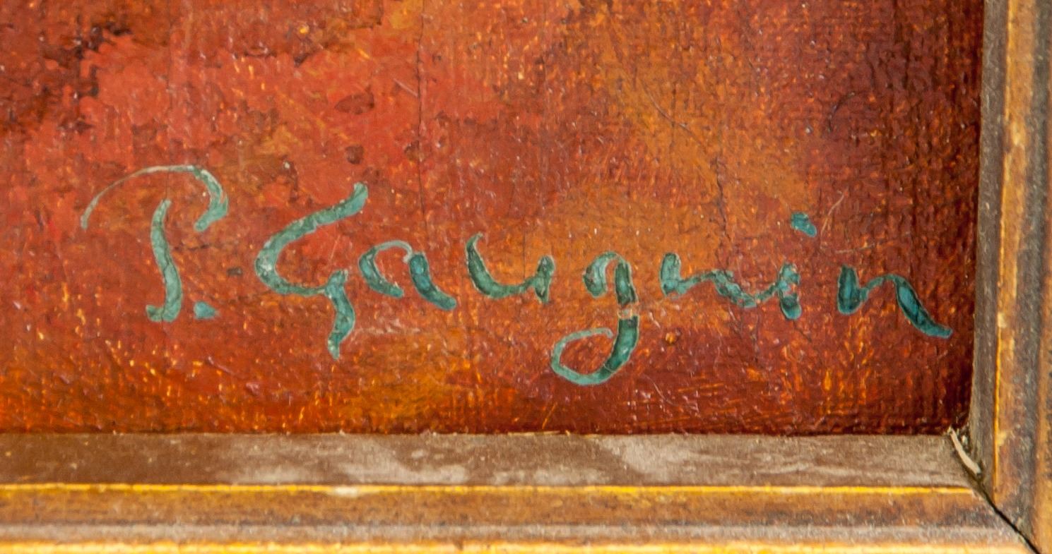 Oil on canvas. Featuring three Tahitians. Signed and attr. Paul Gauguin (French, 1848-1903). 15.4 x 11.4 in. (39 x 29 cm). A pioneer of the Symbolist art movement in France, Paul Gauguin is renowned for his “savage” art depicting sumptuous Tahitian women, nude bathers and haystacks in the Breton landscape, and decorative door panels around his hut on the Marquesas Islands in French Polynesia. Although Gauguin began his artistic career with the Impressionists in Paris, during the 1880s he sought to escape from Western civilization—first moving to Brittany and Arles in France, where he met Van Gogh, and then to French Polynesia—in search of a paradise were he could create pure, “primitive” art. “There is no such thing as exaggeration in art,” wrote Gauguin in 1885. “And I even believe that there is salvation only in extremes.” PROVENANCE: Southern Ontario estate