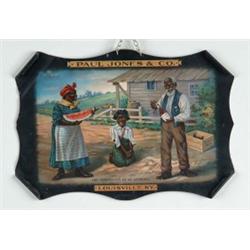 PAUL JONES & CO. WHISKEY SIGN. Early stone lithographed die-cut tin sign with curled corners featuring stereotyped black family image with watermelon, captioned βTHE TEMPTATION OF ST. ANTHONY.β SIZE: 19 1/2β w. x 13 1/2β t. CONDITION: Creases to top and bottom left corners; few surface blemishes; otherwise very good condition and displays nicely. PF 1-3451 (600-800)