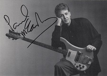 (b. 1942) Lead singer and bass player with the Beatles, co-composer with John Lennon of most of the group's dozens of hits. S.P. "Paul McCartney", b/w postcard, 4" x 6", a photo of McCartney resting his head on his hand with his bass guitar, with "all the best" penned on verso. Fine.