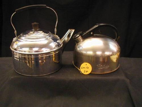 PAUL REVERE CHROME TEAPOTS (1) 1940'S ORIGINAL TEA KETTLE COPPER BOTTOM W/BAIL HND., (1) WHISTLING TEAPOT COPPER BOTTOM, 2 PC