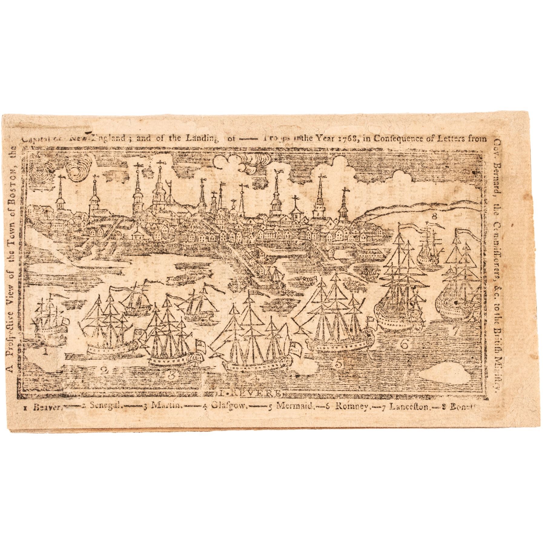 “A Prospective View of the Town of BOSTON, the Capitol of New England ; and of the Landing of ---- Troops in the Year 1768, in Consequence of Letters from Gov. Bernard, the Commissioners, & c. to the British Ministry. - EDES & GILL’s North - American ALMANACK For the Year 1770” Paul Revere’s Historic Engraved Print of the British Troops Landing at Boston Harbor per the British “Intolerable Acts”