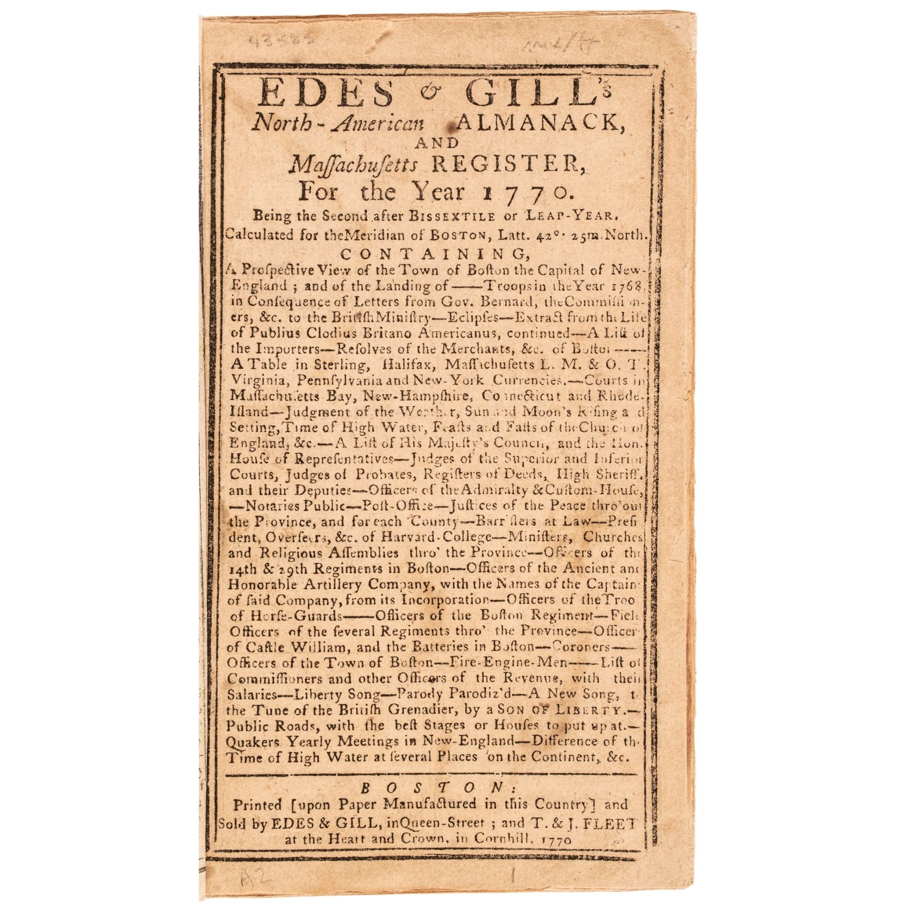 REVERE, PAUL (1735-1818, artist). Edes & Gill's North-American Almanack, and Massachusetts Register for the Year 1770. Boston: sold by Edes and Gill in Queen Street and T. & J. Fleet at the Heart and Crown in Cornhill, 1770, (printed in 1769 for the coming year 1770).