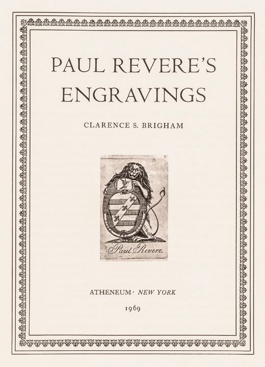 (PAUL REVERE). “PAUL REVERE’S ENGRAVINGS,” by Clarence S. Brigham, 1969 Edition, published by the ATHENEUM, NY, Choice Extremely Fine.