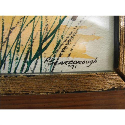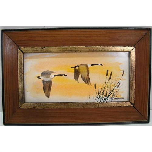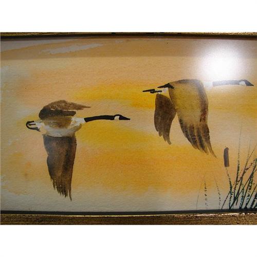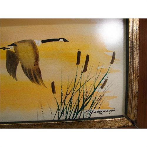 PAUL SCARBOROUGH (AMERICAN, 20TH CENTURY) CANADA GOOSE WATERCOLOR PAINTING. Watercolor on board. Depicts a pair of Canada geese in flight over some cattails. Signed in lower right “P. Scarborough/71”. 6” x 12”. Frame: 11” x 17”.