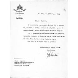 (1897 - 1978) GIOVANNI BATTISTA MONTINI Pope who issued the encyclicals for clerical celibacy and against birth control, an avid supporter of church reunion and social justice. T.L.S. "G. B. Montini" on his Secretary of State letterhead, 1p. 4to., The Vatican, Feb. 18, 1944, in Italian to Dr. Roberto Rosselli, the director of a bank, thanking him for a credit to a woman. Boldly signed and very good.