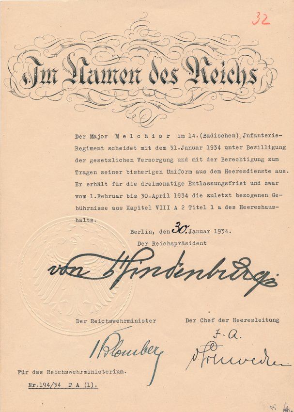 (1847 - 1934) German general and politician, crushed the Russians at Tannenberg and in Poland, forced to yield the Chancellor's office to Hitler in 1933. Partly-printed D.S., 1p. large 4to., Berlin, Jan. 30, 1934, concerns the retirement of a "Major Melchior" of the 14th Infantry Reg. who is to be given his pension and is permitted to wear his uniform. Co-signed by WERNER VON BLOMBERG(1878-1946) Field Marshal, Minister of War, and Commander of the Wehrmacht. Very good.