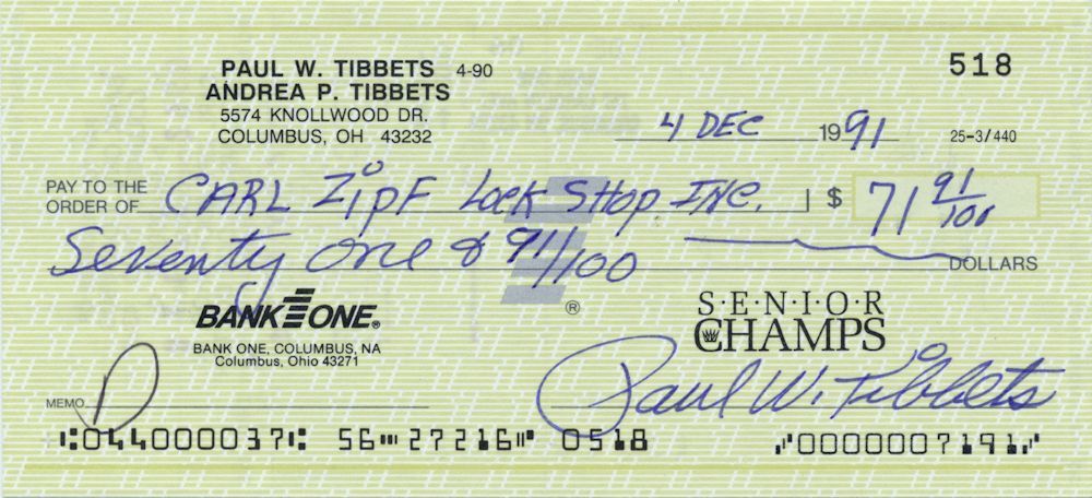 (1915 - 2007) American bomber pilot of the Enola Gay which delivered the first atomic bomb on Hiroshima, August 6, 1945. Partly-printed check, Columbus, OH, Dec. 4, 1991, drawn on Bank One and ordering a $71.91 payment to Carl Zipf Lock Shop Inc. Boldly engrossed and signed, fine. With a 5" x 7" b/w image.