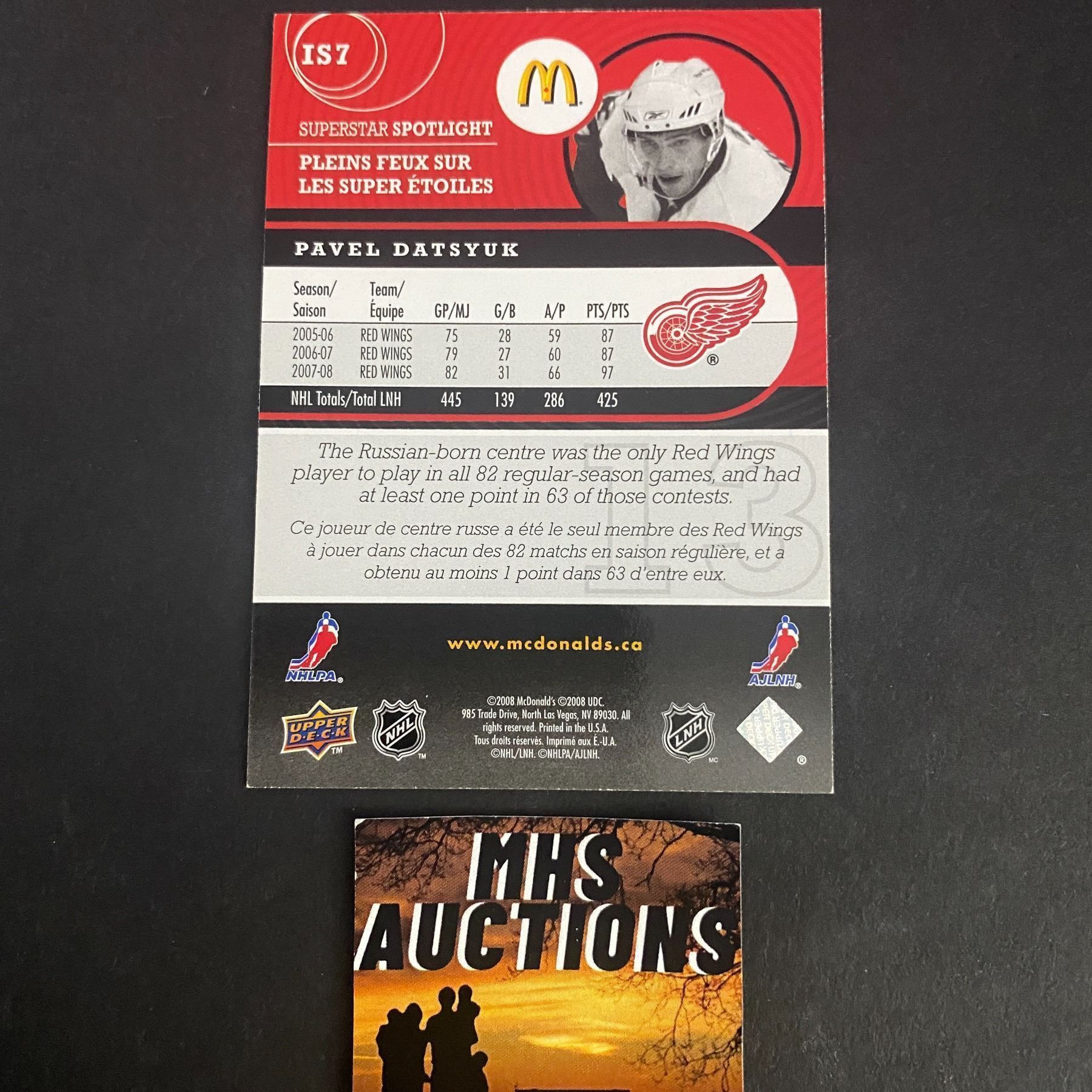 PAVEL DATSYUK INSERT CARD 2008 MCDONALDS