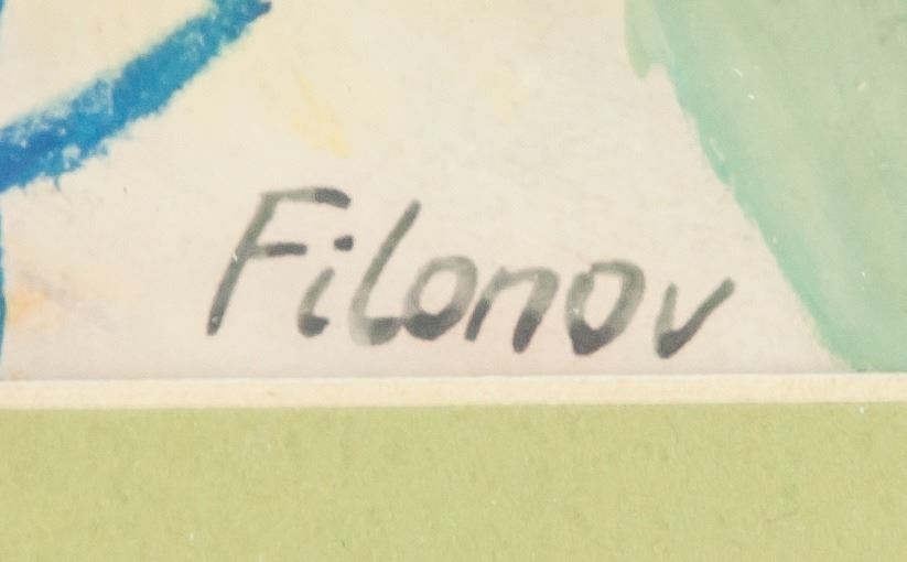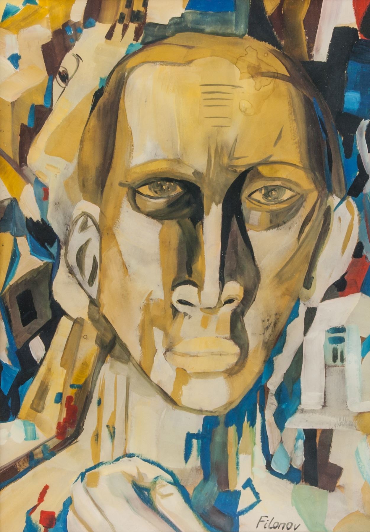 Gouache on paper. Featuring a portrait. Signed and attr. Pavel Filonov (Russian, 1883-1941). 10.2 x 7.3 in. (26 x 18.5 cm). Russian modernist Pavel Filonov is known for founding “Analytical Realism,” a detail-oriented style of painting developed largely in response to Cubism. While Filonov’s imagery contains the sort of deconstructed forms and compressed pictorial spaces associated with Cubism, his main objective was to represent the inner being of the subject, a concern he found sorely lacking in Cubism’s rigid focus on physical characteristics. Filonov’s dynamic style reflects that of his Russian Futurist contemporaries, and his oftentimes systematic application of paint echoes the Divisionism of Georges Seurat. The artist was also an educator, insisting that his students build their pictures as he did: bit by bit, detail by detail, using small brushes to make fine marks. While a keen observer of the modern art movements of his time, Filonov’s subject matter owes to Russian folklore and his own imagined iconography. PROVENANCE: Southern Ontario estate