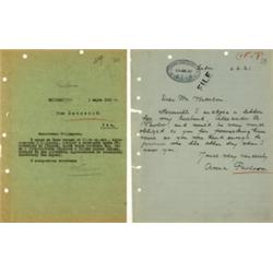 <b>1347. ANNA PAVLOVA </b>(1882 - 1931) Russian ballerina famed for her dance creations and school for the teaching of dance. Manuscript L.S. 1p. 4to., London, June 6, 1921 asking a member of the Russian Legation in London to forward a document issued for the use of her husband. Legation stamp at top, file holes at left margin, else very good.<b> $200-300</b>