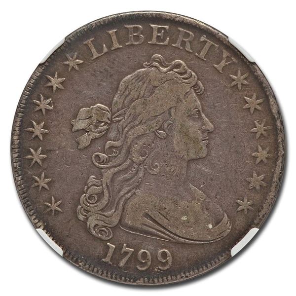 1899 Draped Bust Dollar VF25 This Draped Bust Silver Dollar features 13 stars and the heraldic eagle reverse that was used from 1798 to 1804. This Si