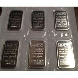 6 ONE OZ .999 PURE SILVER JOHNSON MATTHEY BARS