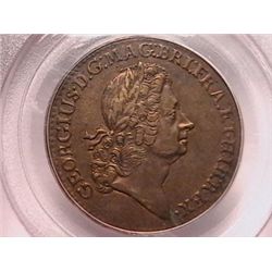 1723 Rosa Americana Two Pence AU50 PCGS. This historic coin shows even medium brown toning. An Englishman, William Wood, obtained a patent from Georg
