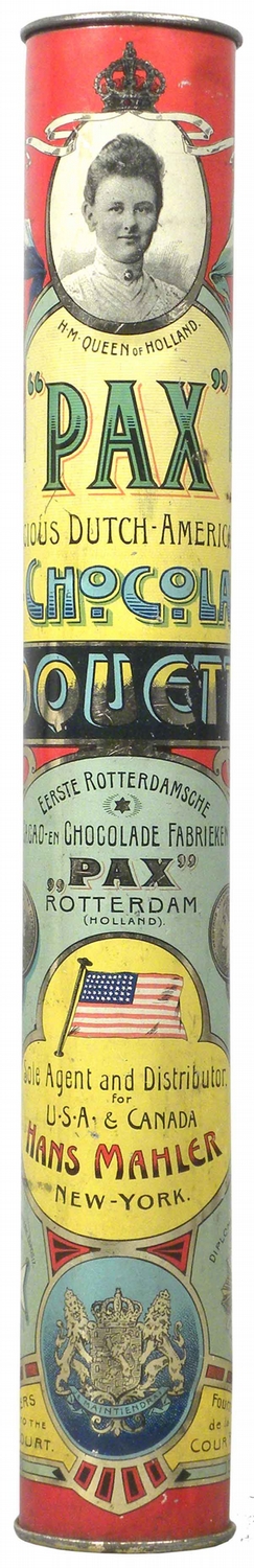 PAX Dutch-American Chocolate Tin. Hans Mahler New York Sole Agent and Distributor. Beautiful tin litho cylinder. Slighly dented at bottom with some very minor paint loss otherwise excellent condition. 11 1/2 inches tall.