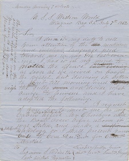 Good war-date Union naval letter by Acting Master Samuel B. Gregory, 1p. 4to., U.S.S. Western World, Wingaw (Winyah) Bay, SC, July 7, 1862, to Asst. Paymaster Seymour Frizelle. In part: "...I deem it my duty to call your attention to the mutinous and insolent language used towards me in my Gig last evening...I request of you Sir to meet me in my cabin before Mr. Cheesboro and the boat crew before whom it was stated, and make a satisfactory apology or I shall present your case to Com. DuPont for Court Martial…the language used on the occasion referred to was 'You can do as you damn please for what I care...". Fine condition.