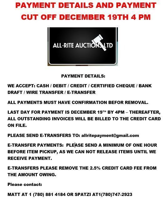 14. Arranged shipping are available and are made by All-Rite Auctions LTD. Shipping prices will be disclosed in your invoice. Alternatively, the bidder does have the option of picking up the lot(s) won from the sale site, within 48 hours.