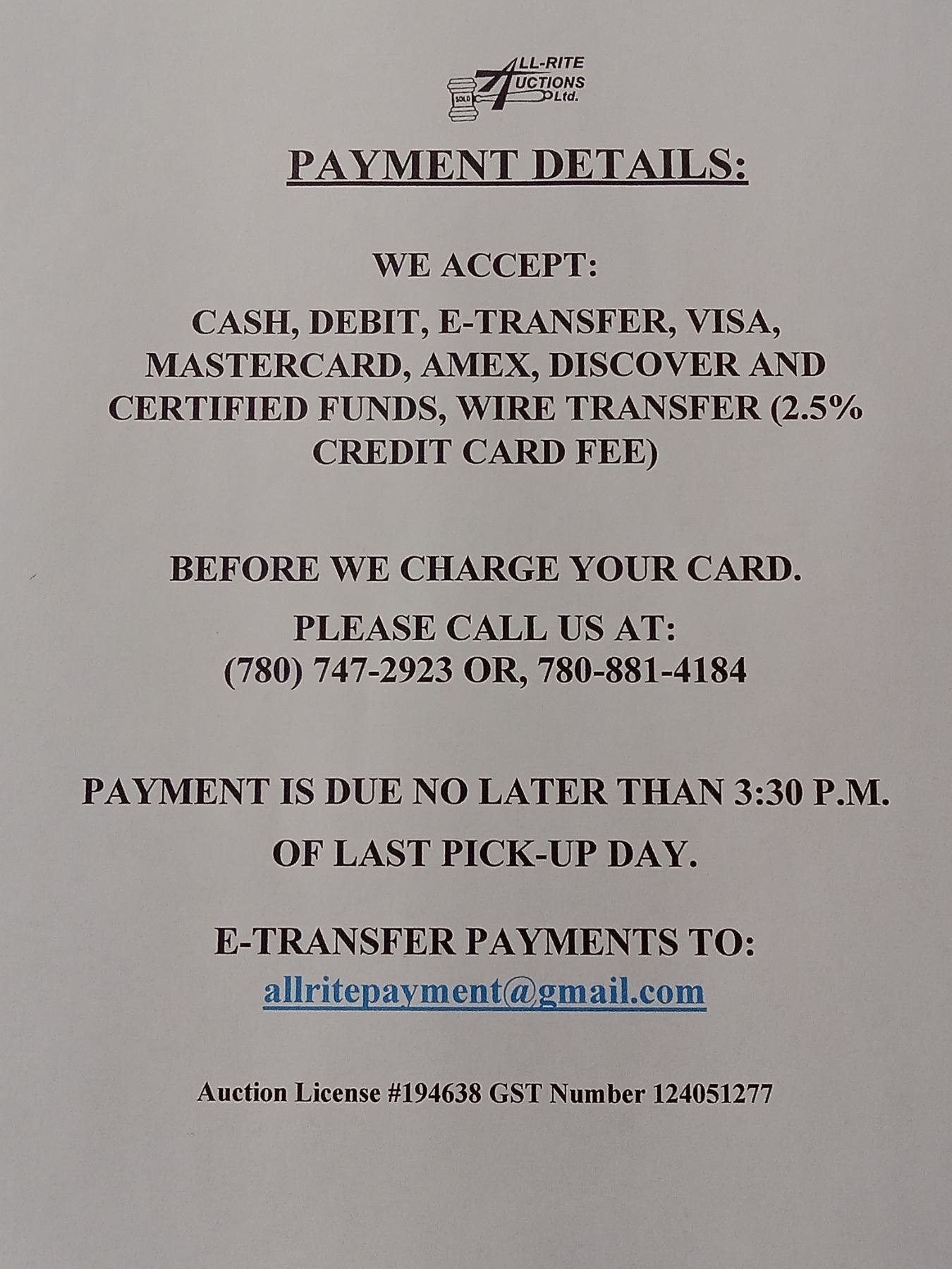 E-TRANSFER PAYMENTS: allriteauction@gmail.com