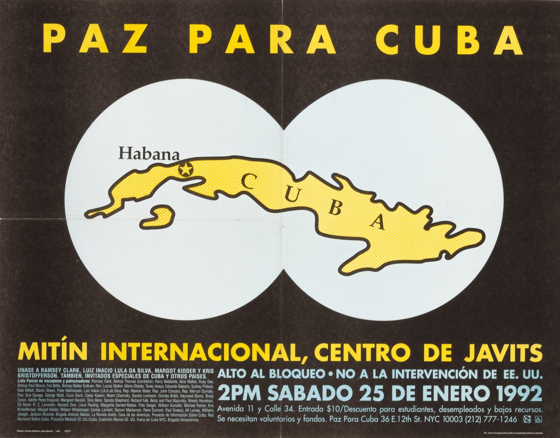Paz Para Cuba poster - 'Peace for Cuba - International Rally at the Javits Convention Center - End The Blockade - No U.S. Military Intervention', designed by Andrea Robbins and Max Becher, New York, NY, 1991, 24 x 18.75 inches. Mailing folds.
