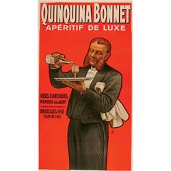 QUINQUINA BONNET APÉRITIF DE LUXE, original vintage poster printed in Paris, circa 1915. A striking poster for this spirit. We see a gentleman waiter proudly pouring the "Apéritif De Luxe". Winner of awards in Brussels and Turin. Rolled on linen. Condition A.
