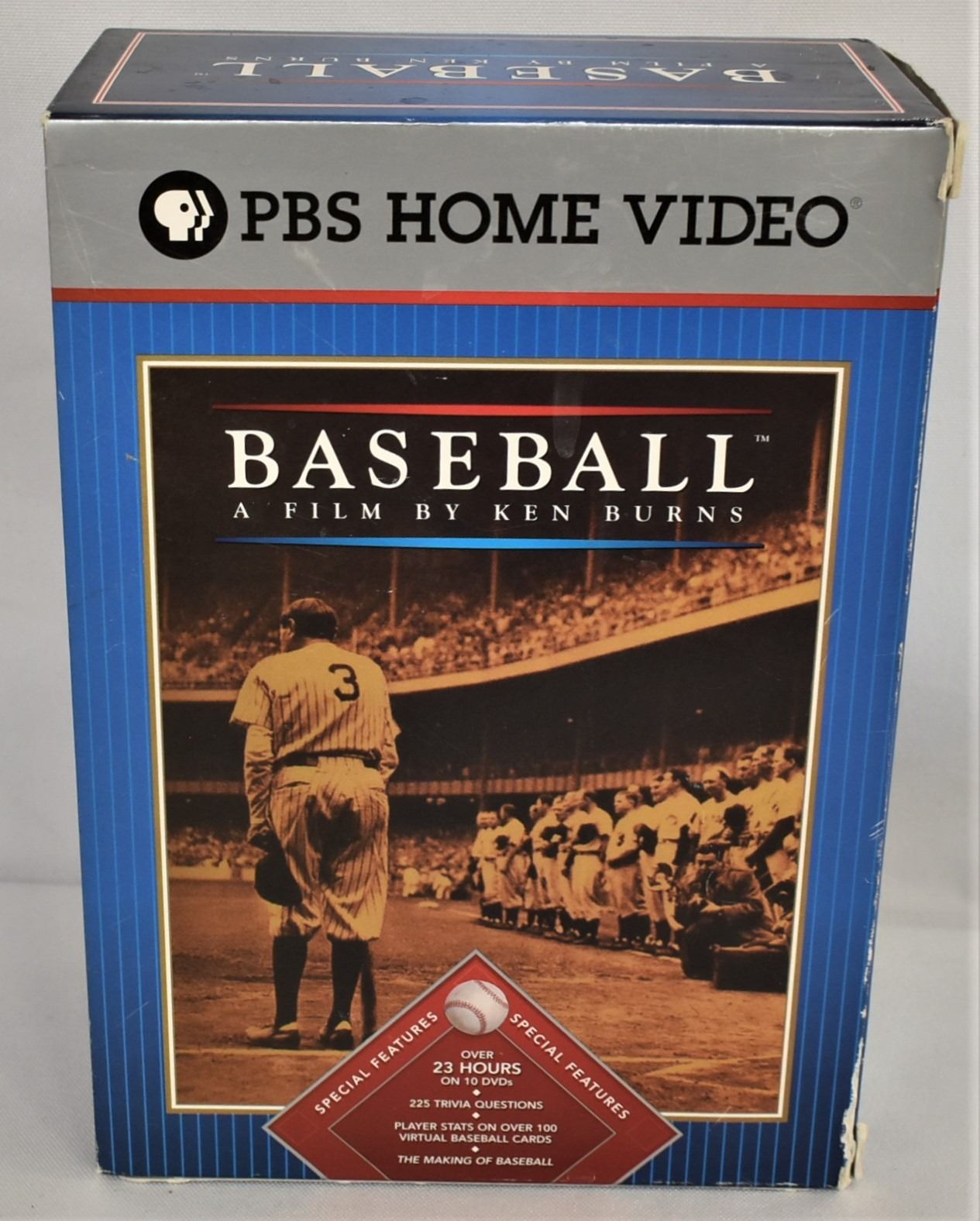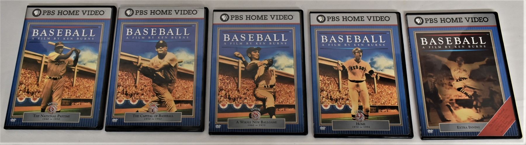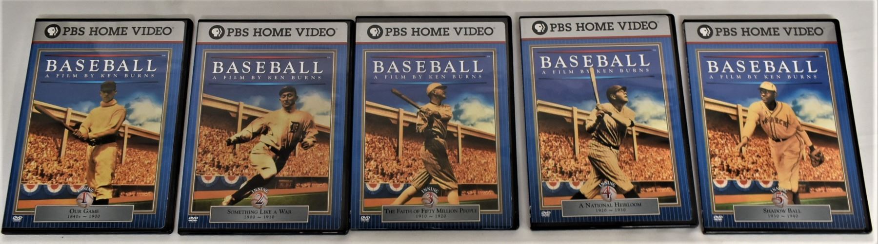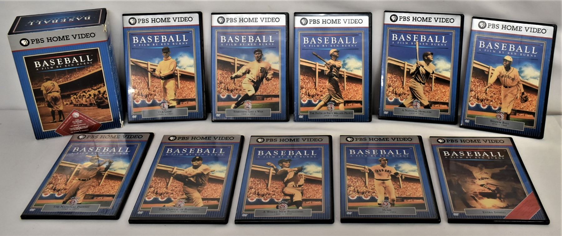 1994 PBS Baseball DVDs, Baseball: A Film by Ken Burns, boxed set, special features: over 23 hours of color/black and white on 10 DVDs with Closed Caption, 225 Trivia Questions, player stats on over 100 virtual baseball cards, the making of Baseball, box measures 7.75'' x 5.25'' x 2.75'', includes 1. Inning 1 Our Game 1840-1900 2. Inning 2 Something Like a War 1900-1910 3. Inning 3 The Faith of Fifty Million People 1910-1920 4. Inning 4 A National Heirloom 1920-1930 5. Inning 5 Shadow Ball 1930-1940 6. Inning 6 The National Pastime 1940-1950 7. Inning 7 The Capital of Baseball 1950-1960 8. A Whole New Ballgame 1960-1970 9. Inning 9 Home 1970-1994 10. Extra Inning