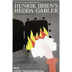 <B>PBS Masterpiece Theatre, Hedda Gabler (1993)</B></I> Bus Shelter Poster (30" X 46"). Hedda Gabler, PBS Mobil Masterpiece/Mystery, 1993, Rolled, Single Sided, US, Presented March 28, 1993. Abstract design of hand/flames by Chermayell and Geismer. The show starred, Fiona Shaw, Stephen Rea, Brid Brennan, and Deborah Warner. Ivan Chermayeff was not only the "house designer" for Mobil Oil, creating their logo and corporate image (and everything else from letterheads to many of the posters in the PBS Masterpiece and Mystery series), he also created a host of other posters and logos, including the famed NBC peacock. Rolled, Very Fine condition.