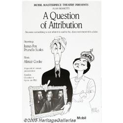 <B>PBS Masterpiece Theatre, Question of Attribution (1990)</B></I> Bus Shelter Poster (30" X 46"). Question of Attribution, PBS Mobil Masterpiece/Mystery, 1992, Rolled, US, Hirschfeld illustration of Fox, holding old master painting and scales, Black and white, three Ninas, James Fox, Prunella Scales. Al Hirschfeld (1903-2003) needs no introduction, just a few notes to put the work on offer into context. Though most noted as a master caricaturist of the Broadway stage and its denizens, during the 1930's Hirschfeld worked in the movie business designing posters, mainly for MGM. His illustrations used to promote the Marx Brothers films of the mid 30's are among the most coveted by film poster collectors. This effort for the Mobil series is among the few times he has worked in this format since his movie studio days. Very Fine condition.