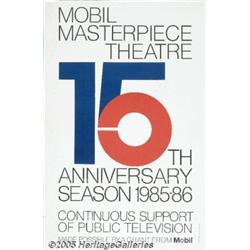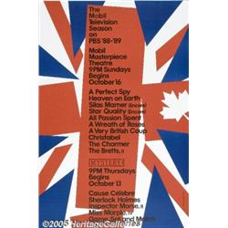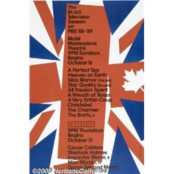 <B>PBS Masterpiece Theatre (1991)</B></I> (5) Bus Shelter Posters (30" X 46"). Masterpiece Theater, 1977-78 Season, PBS Mobil Masterpiece/Mystery, 1977, Rolled, US, Masterpiece theater repeated as if in incandescent bulbs, titles in black: I Claudius, Anna Karenina, Our Mutual Friend, Poldark Series II, Duchess of Duke Street; all on yellow orange. Masterpiece Theatre, 1985-86 Season: Masterpieces, Mysteries, and Specials, PBS Mobil Masterpiece/Mystery, 1986, Rolled, US, Black poster with titles in white. Masterpiece Theatre 15th Anniversary Season, 1985-86, PBS Mobil Masterpiece/Mystery, 1985, Rolled, US, Stylized 15 in blue and red on white field, Staining along left side. Mobil Television Season, 1988 - 89: Masterpiece Theatre and Mystery, PBS Mobil Masterpiece/Mystery, 1988, Rolled, US, Suggestion of Union Jack, Maple leaf, all red white and blue. Masterpiece Theatre 20th Anniversary Season, 1991, PBS Mobil Masterpiece/Mystery, 1991, Rolled, US, Bits of illustration in title, list of episodes below. Very Fine condition. 5 items