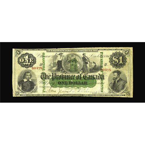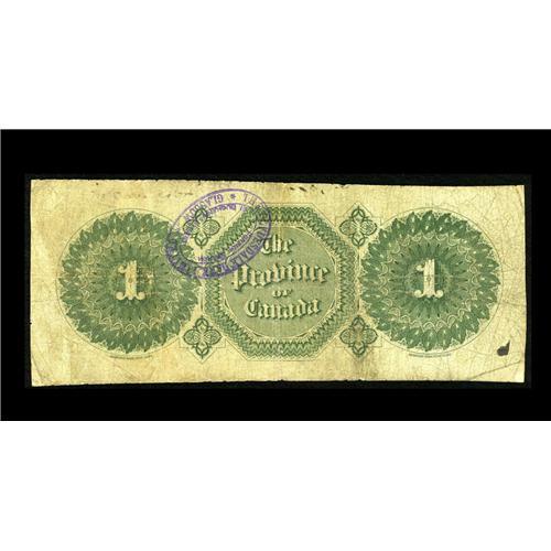 <B>PC-2b $1 1866</B></I><BR>An attractive example payable at Toronto. The colors are strong and the Toronto overprint quite sharp, as are the portraits of Samuel de Champlain on the left and Jacques Cartier on the right. There is a purple bank stamp from the Clydesdale Bank of Glasgow, Scotland on the reverse. <B>Fine.</B></I><BR><I>From The Halton Lake Collection</B></I>
