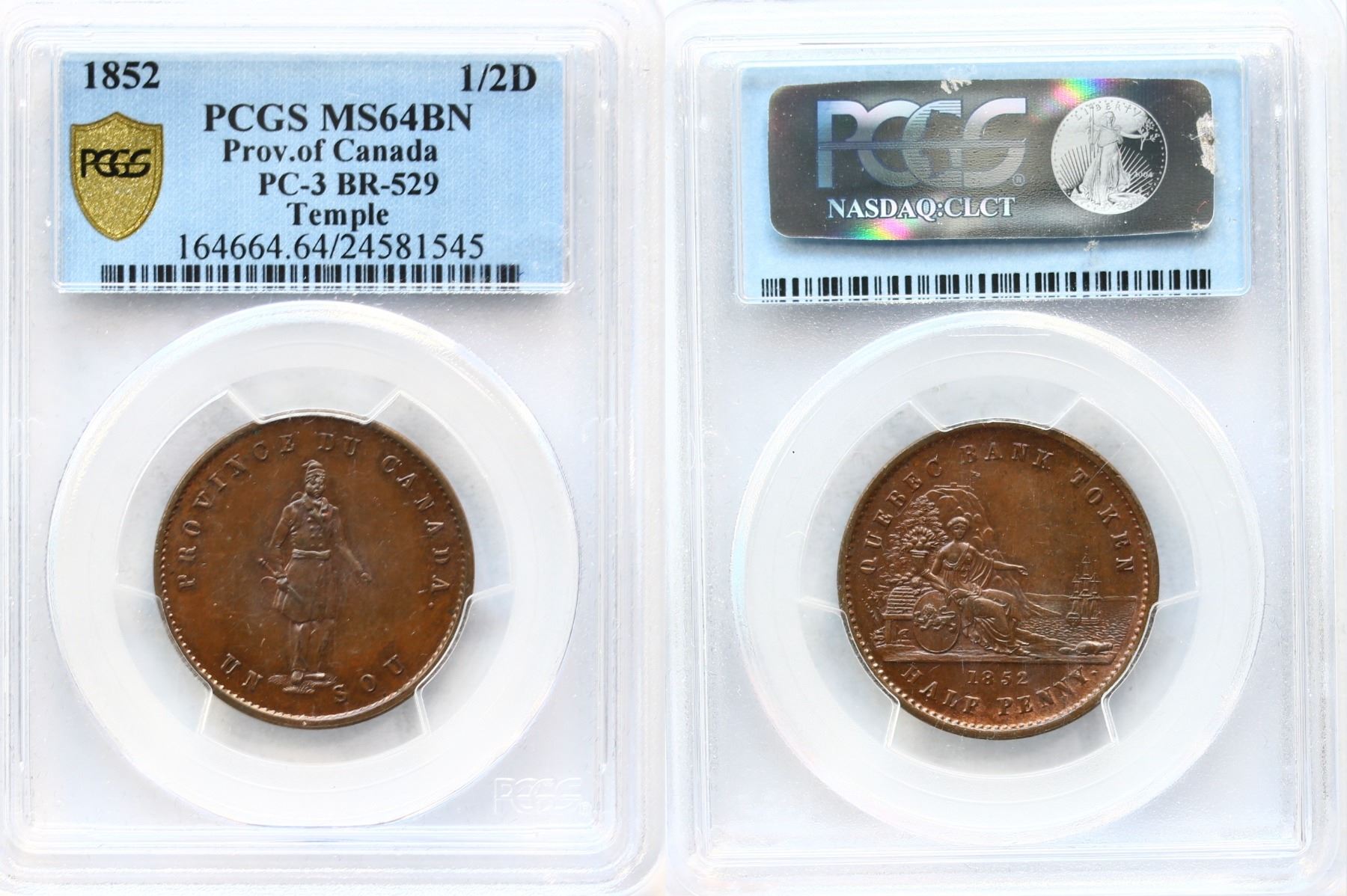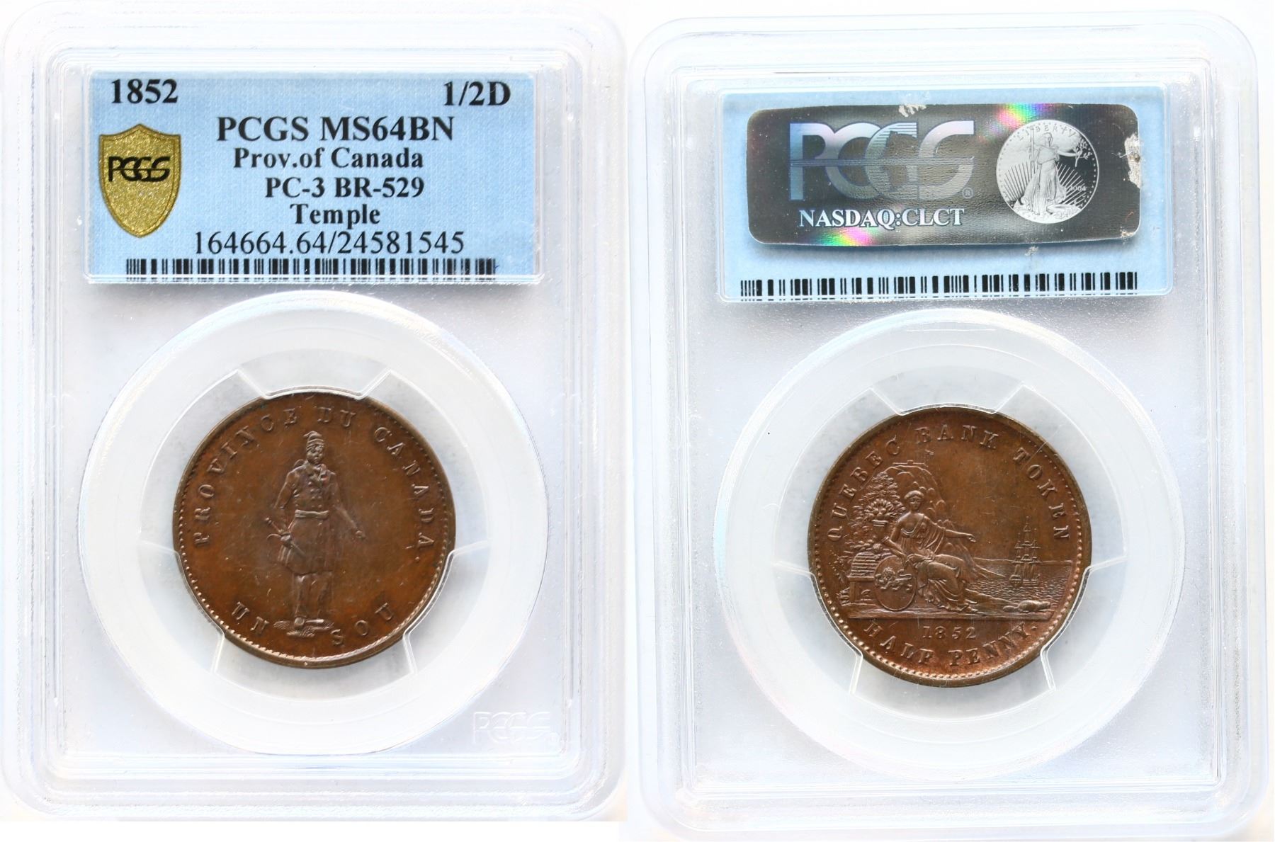 PC-3, Breton #529, 1852 1/2d PCGS MS64. A superb example with trace of red.