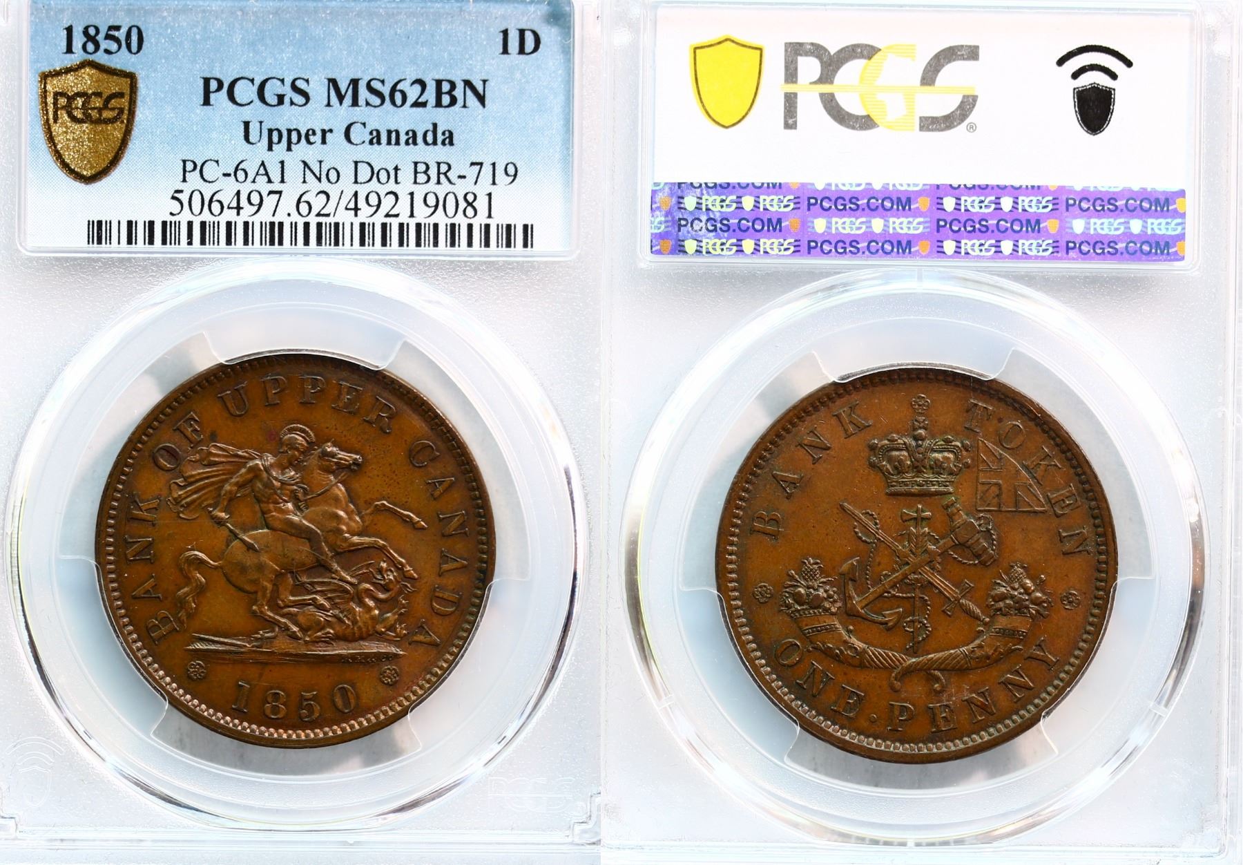 PC-6A1, Br:719 1850 1p "No Dot" PCGS MS62 BN