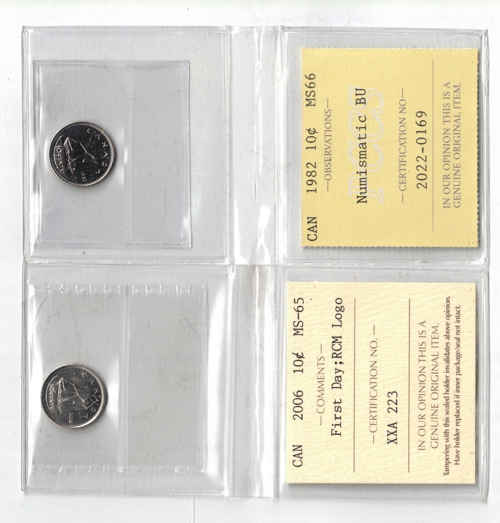PCCS 1982 10¢ MS66 NBU, ICCS 2006 10¢ First Day MS65  Professional Coin Certification System