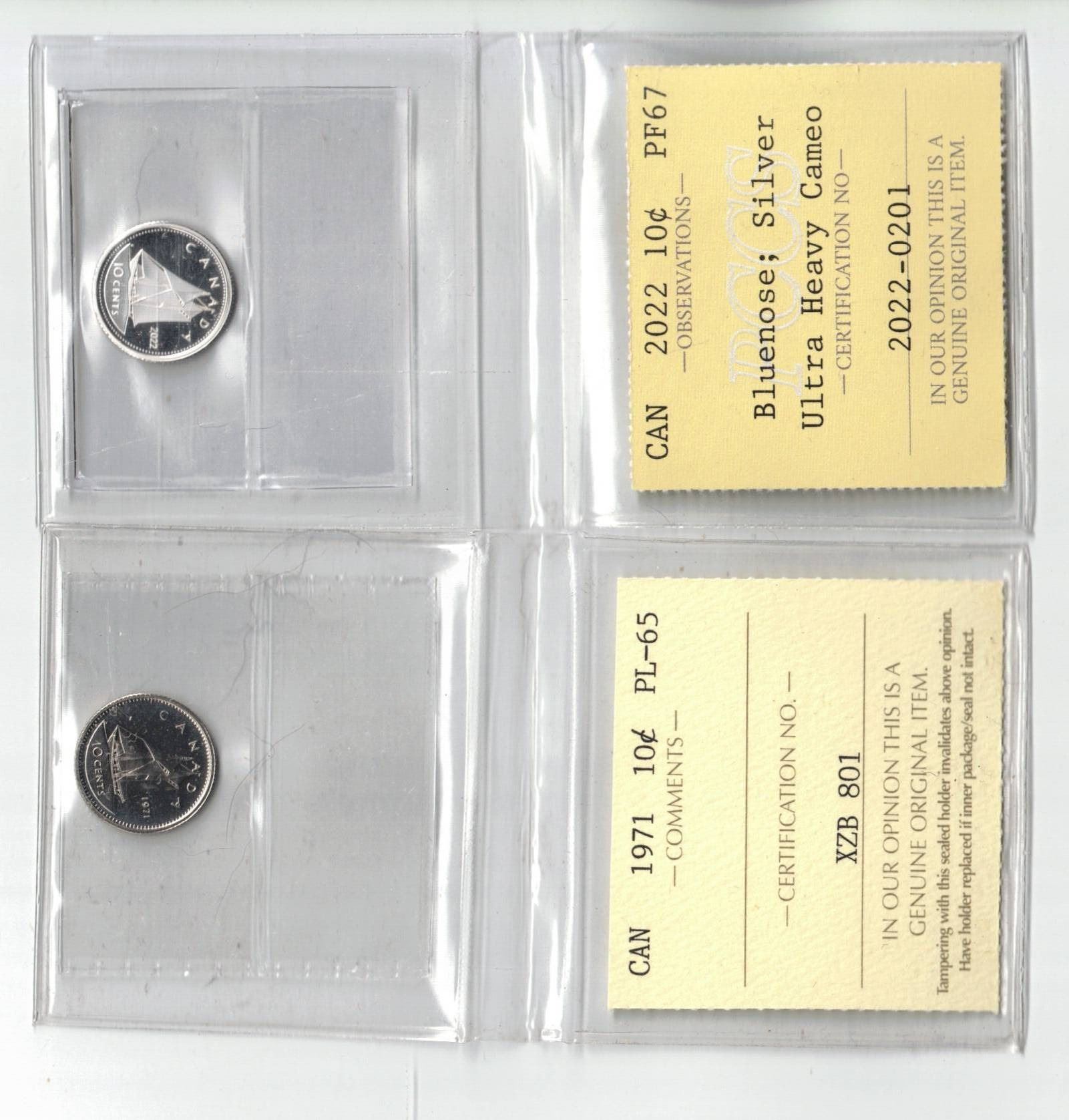 PCCS 2022 10¢ PF67, ICCS 1971 10¢ PL65 Professional Coin Certification System