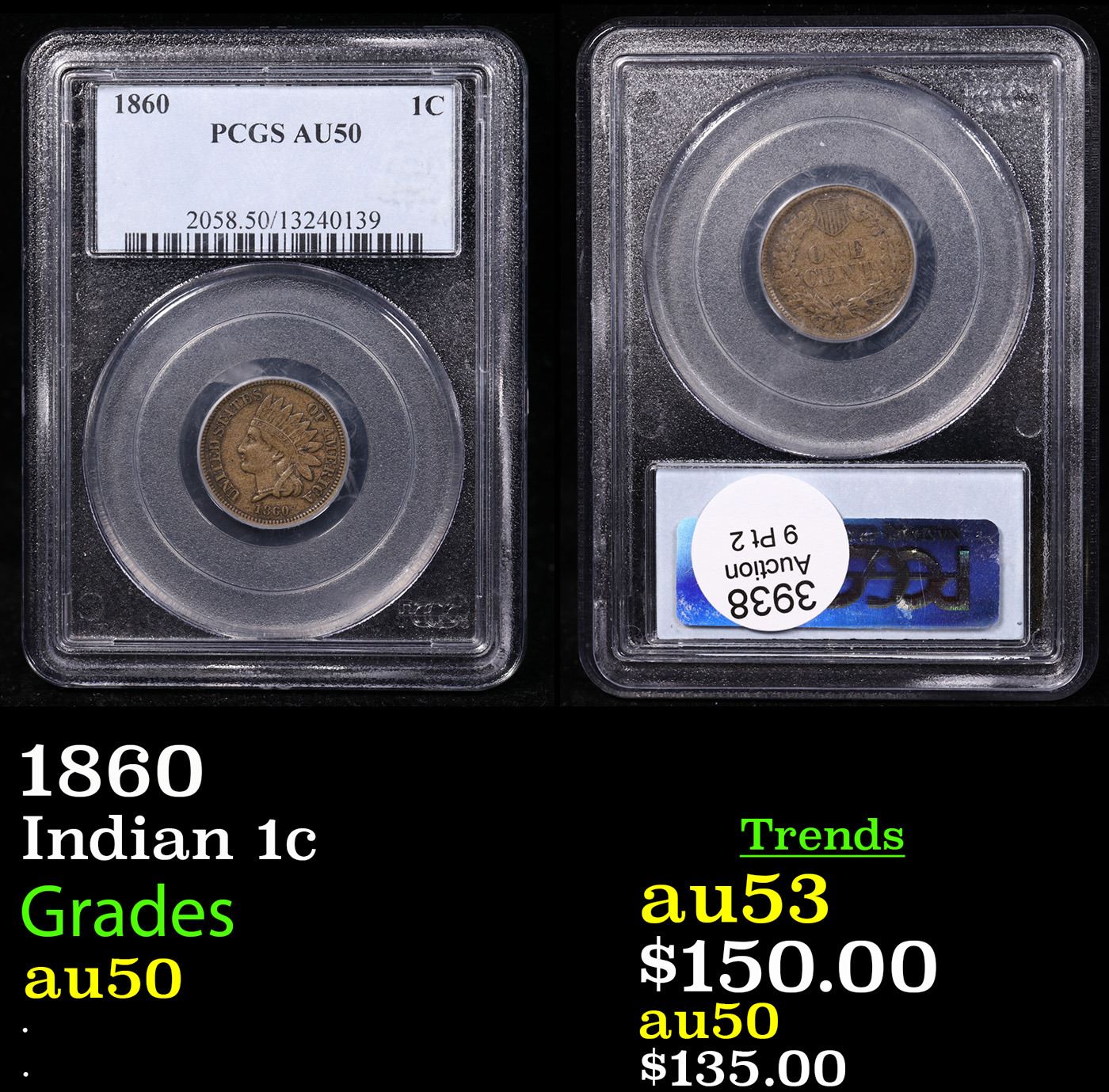 PCGS 1860 Indian Cent 1c Graded au50 By PCGS.