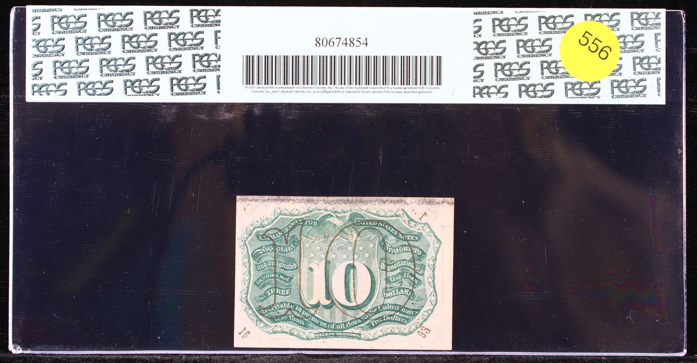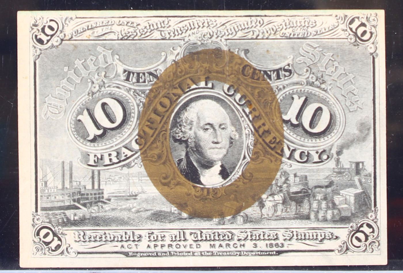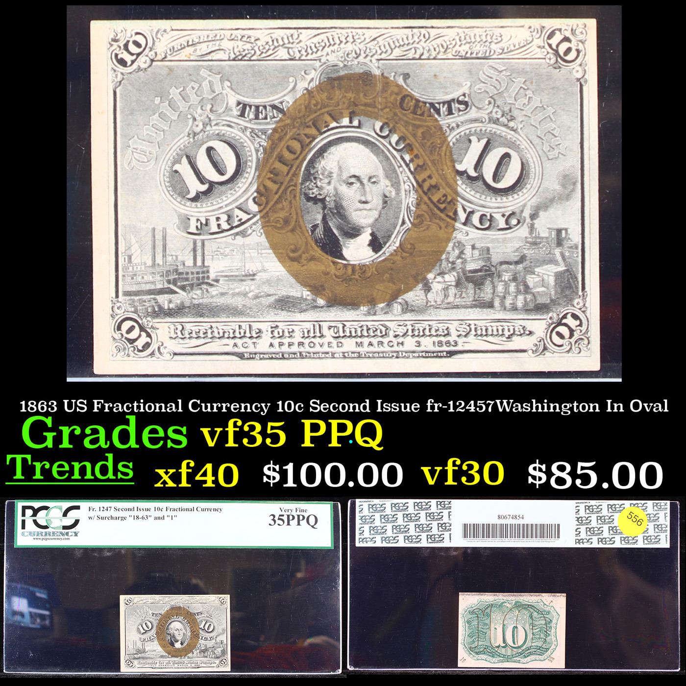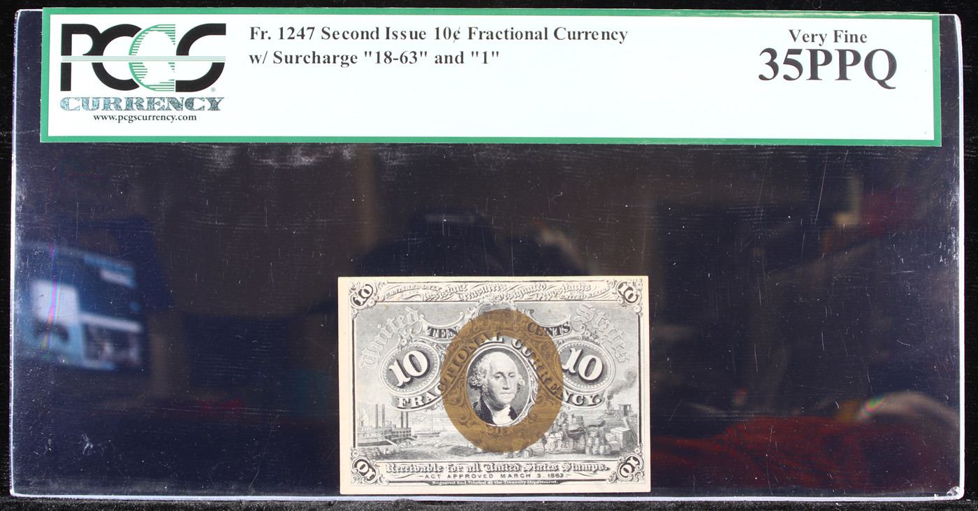 PCGS 1863 US Fractional Currency 10c Second Issue fr-12457Washington In Oval Graded vf35 PPQ By PCGS. Fractional or postage currency has a rich history. At the beginning of the Civil War people starting hoarding coins for their precious metal content. Coins became difficult to find because of the hoarding. People started to try to use stamps instead of coins as a means of commerce. The government decided to help ease the hoarding issue by issuing “paper coins” also known as postage currency or fractional currency. Fractional currency was first issued on August 21, 1862 and they were last issued on February 15, 1876. Three cents, five cents, ten cents, twenty-five cents, and fifty cents notes were all issued. Fractional currency is physically smaller than other United States money. It also does not have a serial number.