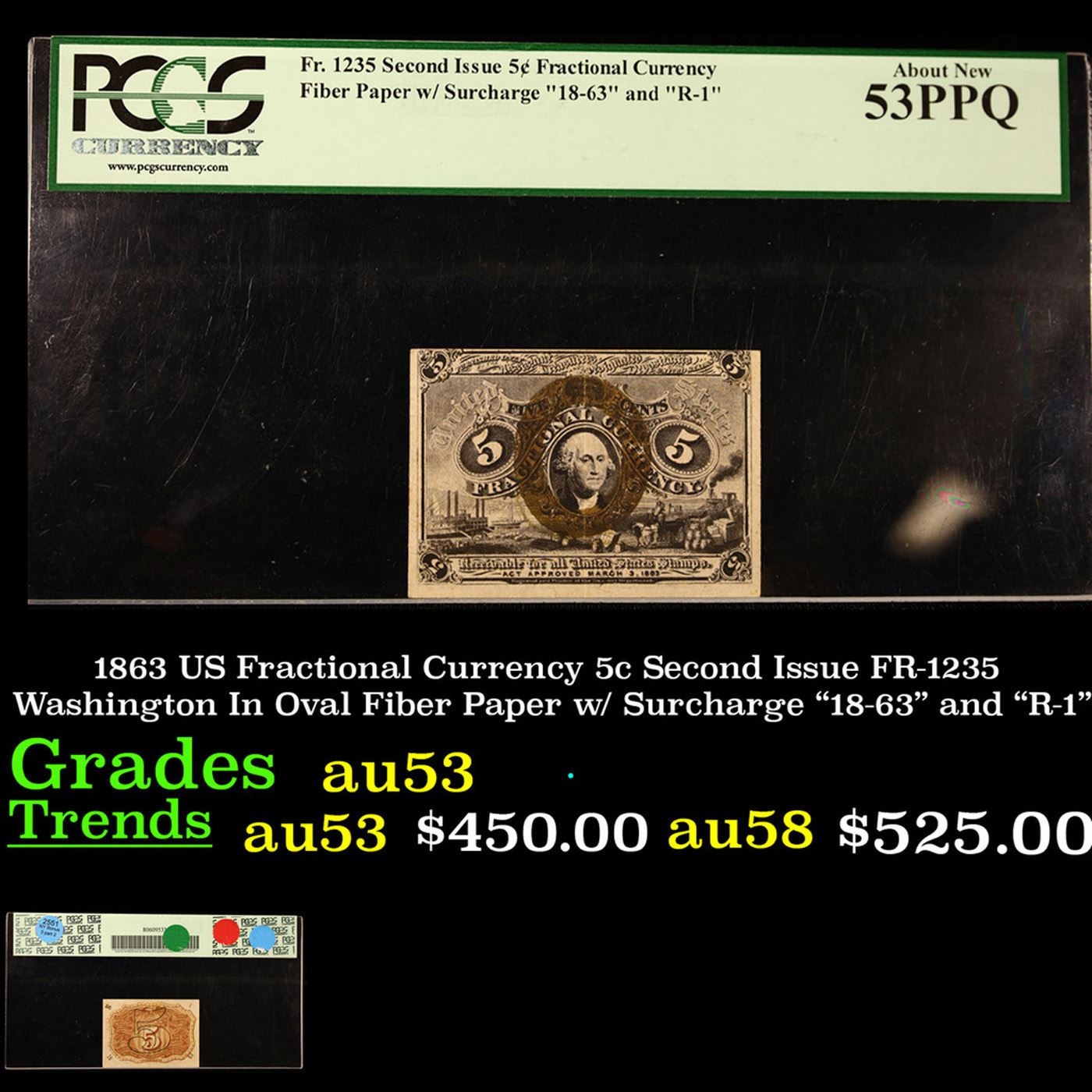 PCGS 1863 US Fractional Currency 5c Second Issue FR-1235 Washington In Oval Fiber Paper w/ Surcharge "18-63" and "R-1" Graded au53 By PCGS. Fractional or postage currency has a rich history. At the beginning of the Civil War people starting hoarding coins for their precious metal content. Coins became difficult to find because of the hoarding. People started to try to use stamps instead of coins as a means of commerce. The government decided to help ease the hoarding issue by issuing “paper coins” also known as postage currency or fractional currency. Fractional currency was first issued on August 21, 1862 and they were last issued on February 15, 1876. Three cents, five cents, ten cents, twenty-five cents, and fifty cents notes were all issued. Fractional currency is physically smaller than other United States money. It also does not have a serial number.