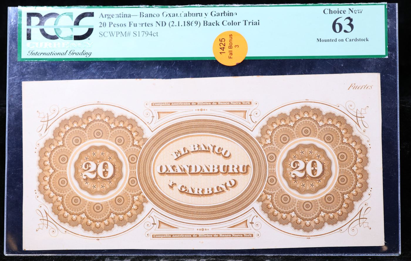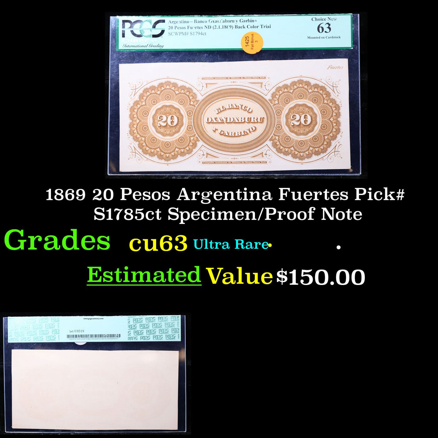 PCGS 1869 20 Pesos Argentina Fuertes Pick# S1785ct Specimen/Proof Note Graded cu63 By PCGS