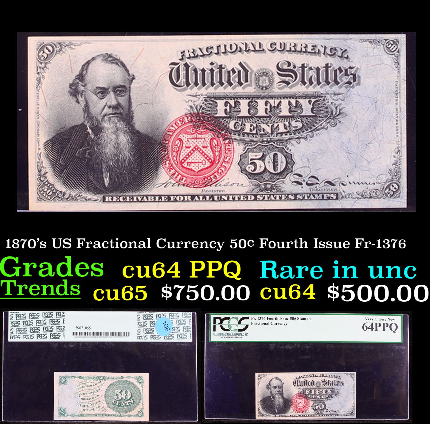 PCGS 1870's US Fractional Currency 50¢ Fourth Issue Fr-1376 Graded cu64 PPQ By PCGS. 0