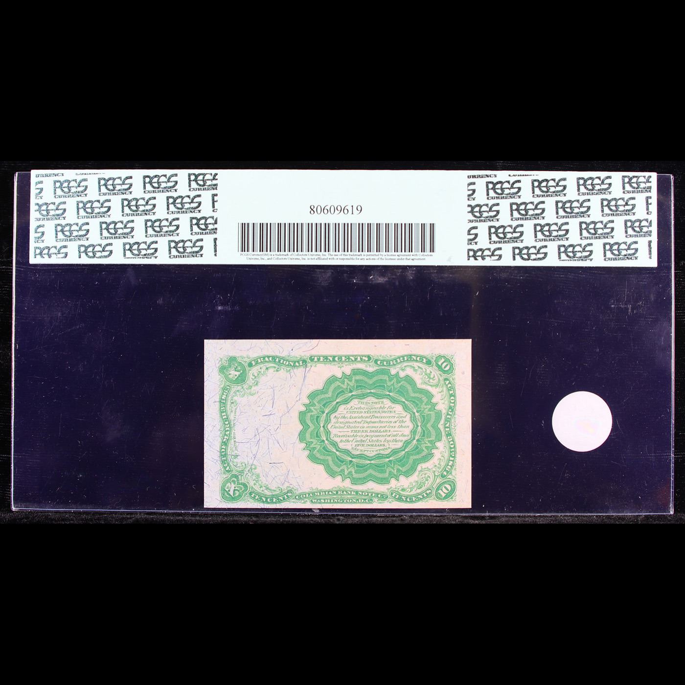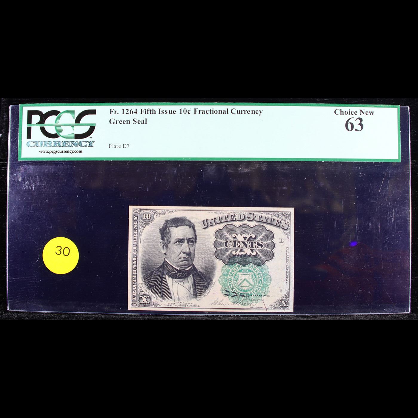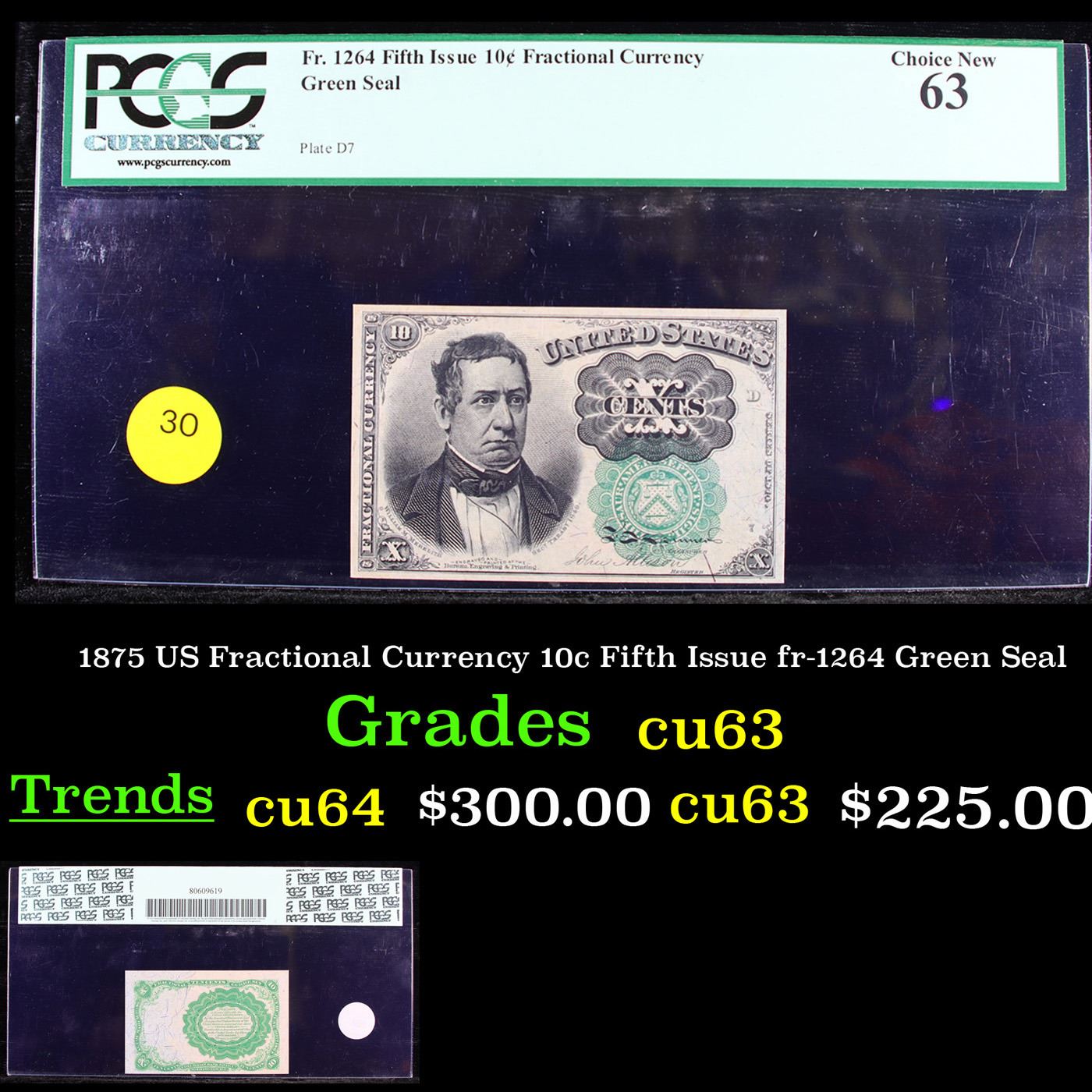 PCGS 1875 US Fractional Currency 10c Fifth Issue fr-1264 Green Seal Graded cu63 By PCGS. Fractional or postage currency has a rich history. At the beginning of the Civil War people starting hoarding coins for their precious metal content. Coins became difficult to find because of the hoarding. People started to try to use stamps instead of coins as a means of commerce. The government decided to help ease the hoarding issue by issuing “paper coins” also known as postage currency or fractional currency. Fractional currency was first issued on August 21, 1862 and they were last issued on February 15, 1876. Three cents, five cents, ten cents, twenty-five cents, and fifty cents notes were all issued. Fractional currency is physically smaller than other United States money. It also does not have a serial number.