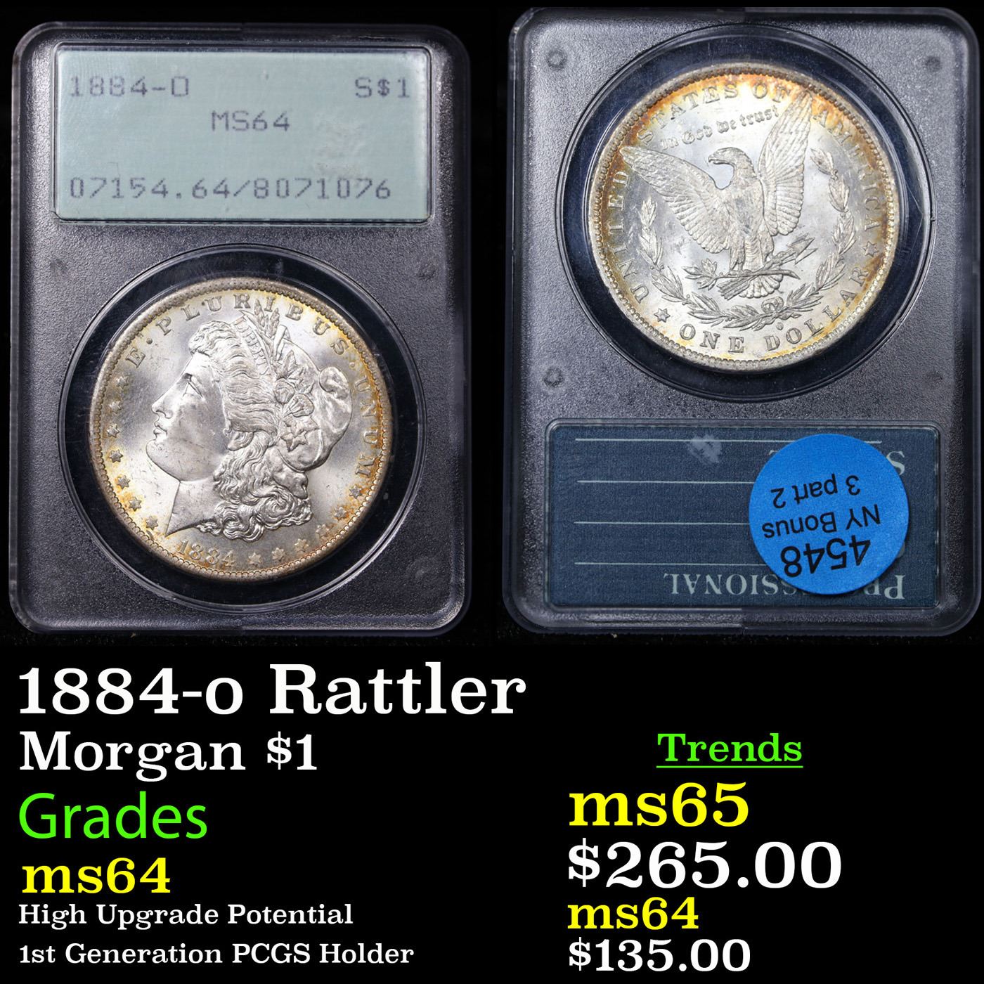 PCGS 1884-o Rattler Morgan Dollar $1 Graded ms64 By PCGS.
