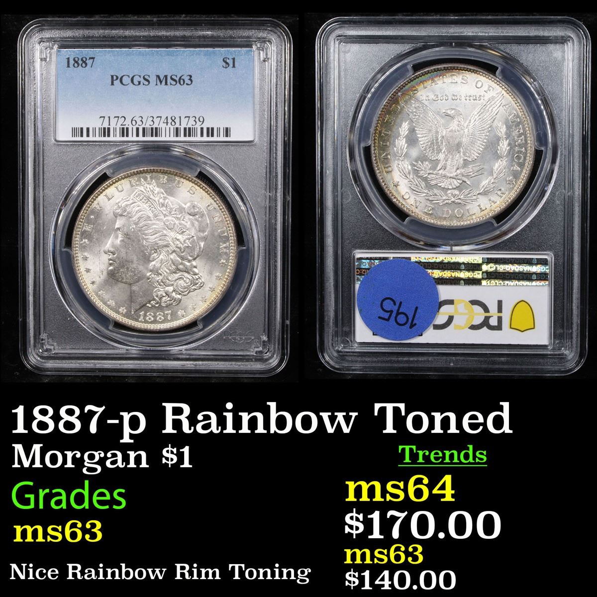 PCGS 1887-p Rainbow Toned Morgan Dollar $1 Graded ms63 By PCGS.