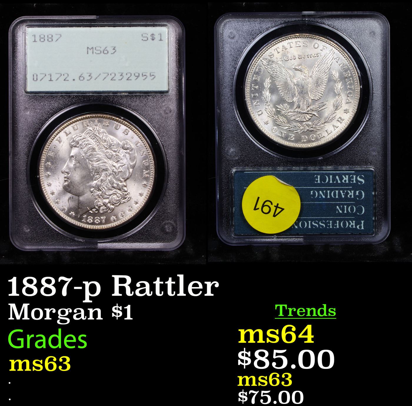 PCGS 1887-p Rattler Morgan Dollar $1 Graded ms63 By PCGS.