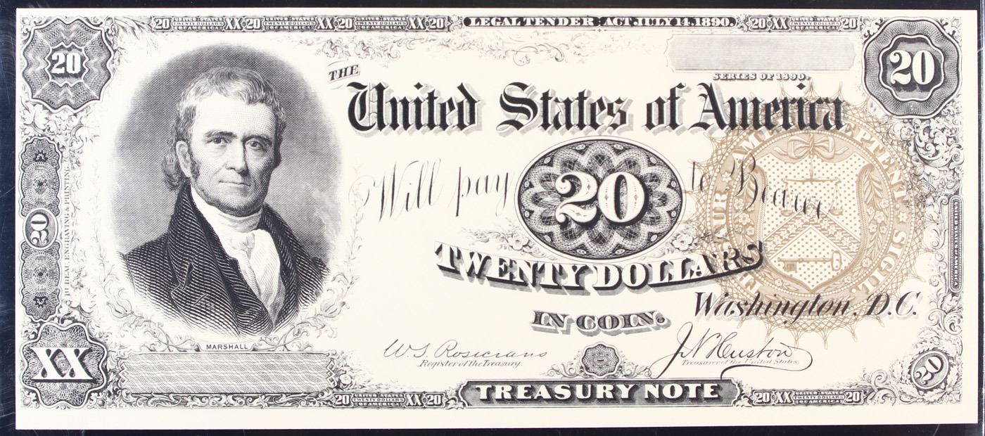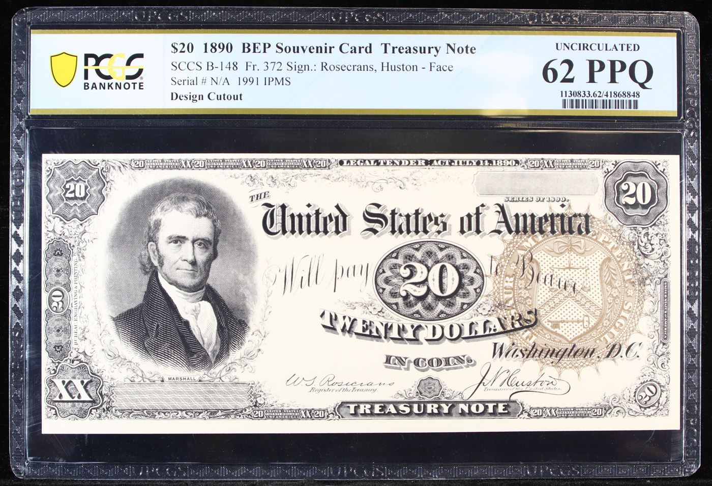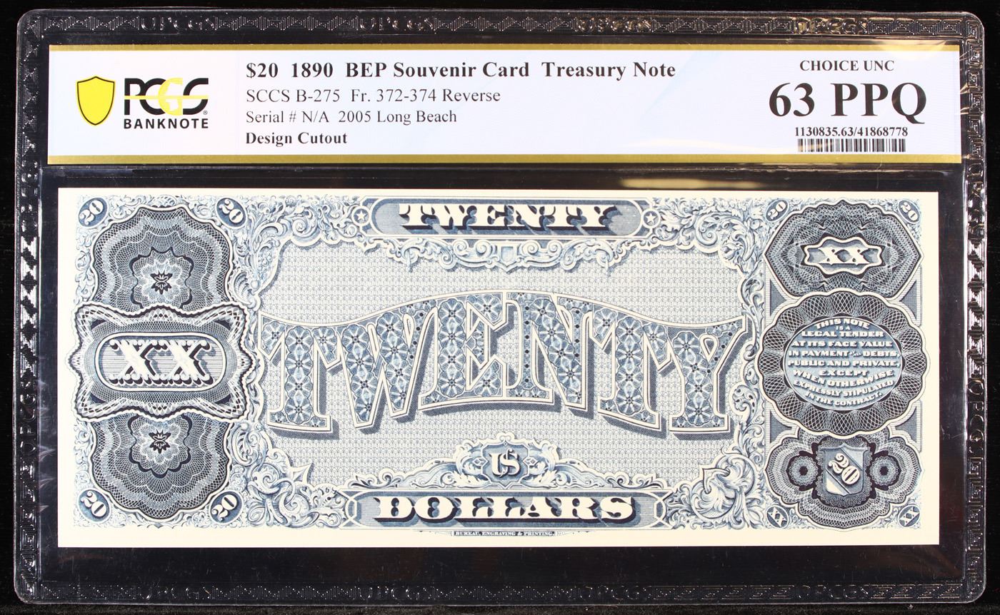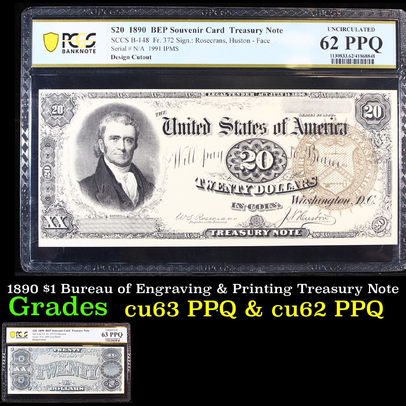 PCGS 1890 $1 Bureau of Engraving & Printing Treasury Note Graded cu63 PPQ By PCGS. Up for auction is a Bureau of Engraving and Printing (BEP) Proof Print . It is printed using the original Plates from the Bureau of Engraving and Printings archives. It was printed on two separate strikes, for the front and the back. It lacks serial numbers, but otherwise is a perfect proof of the Incredibly rare Piece of Currency.