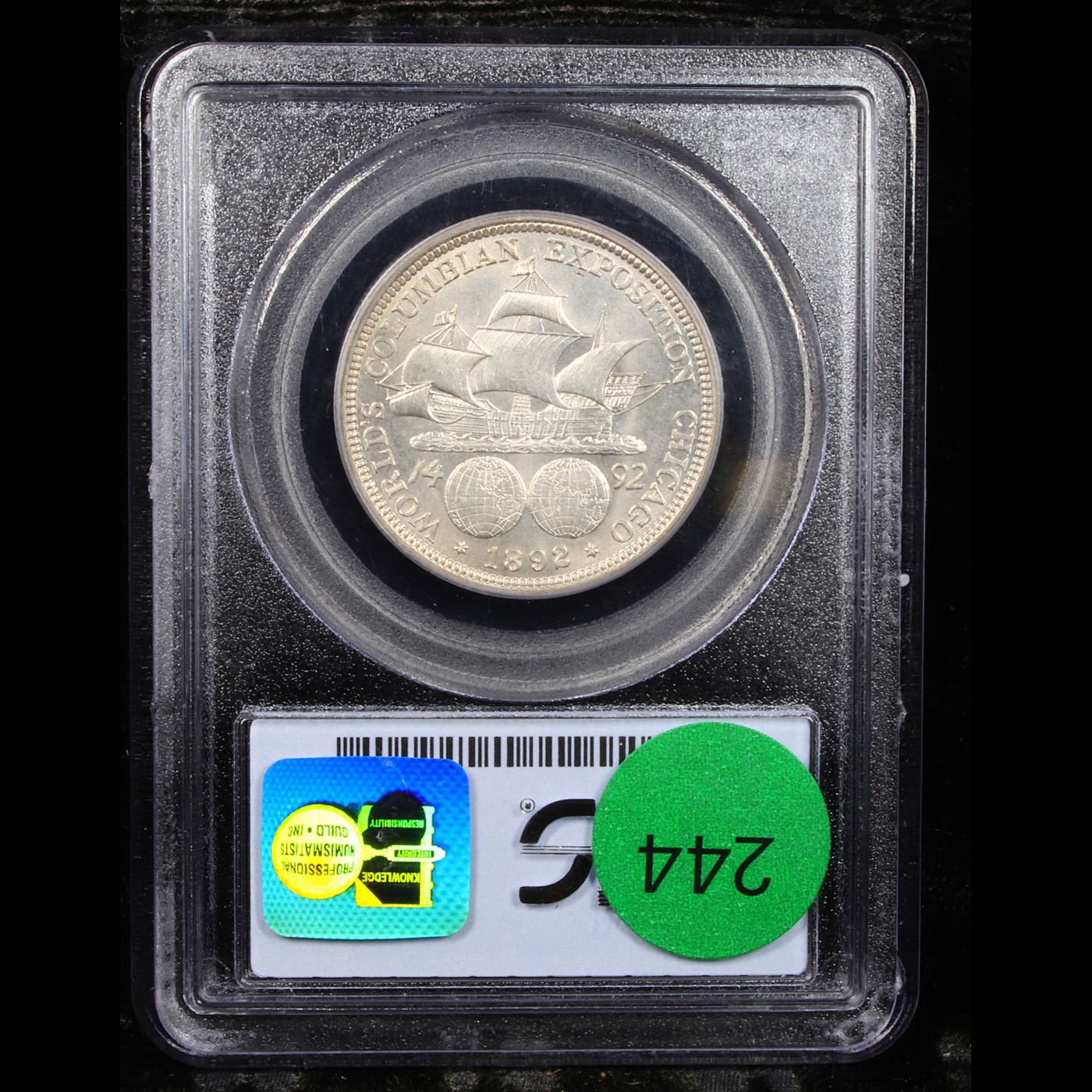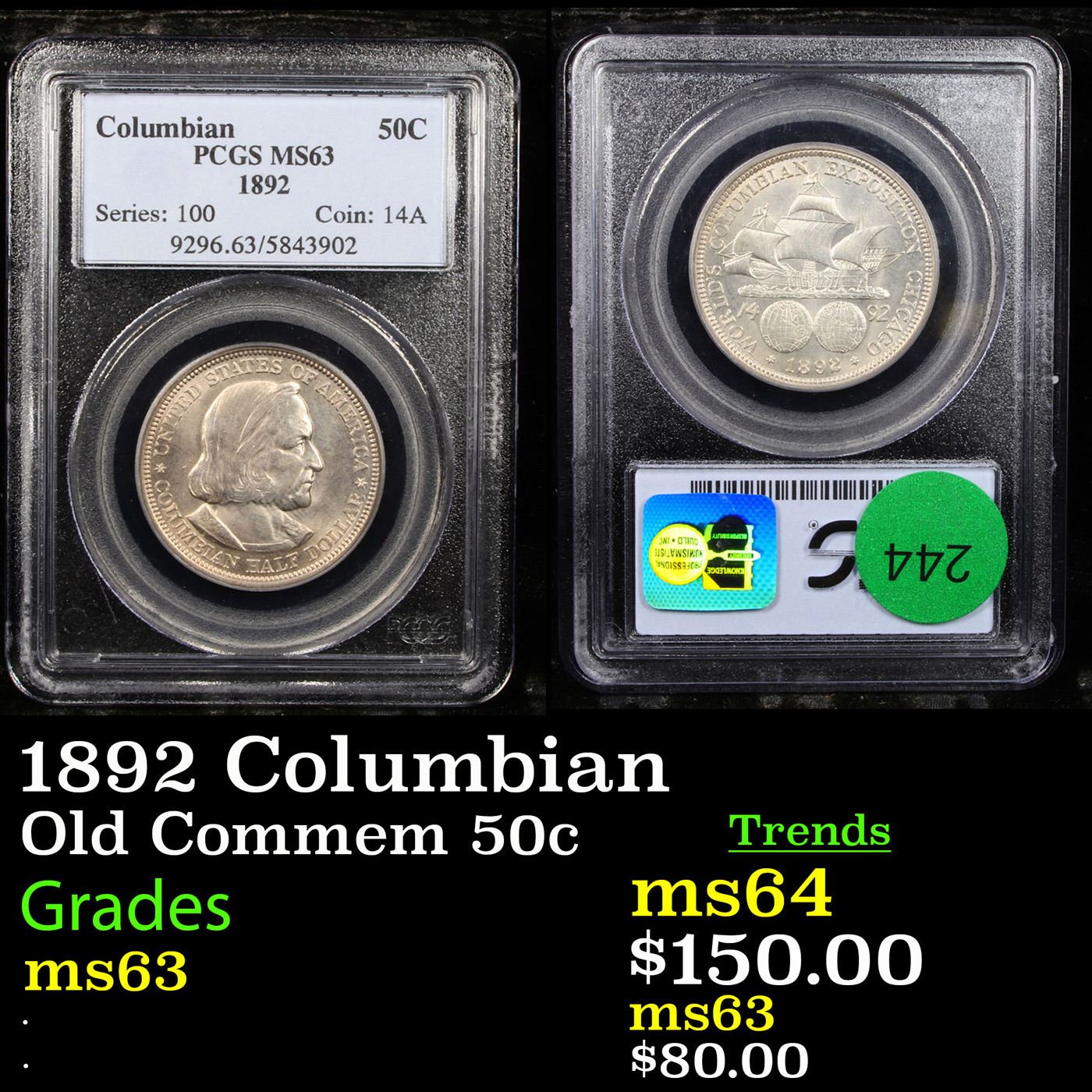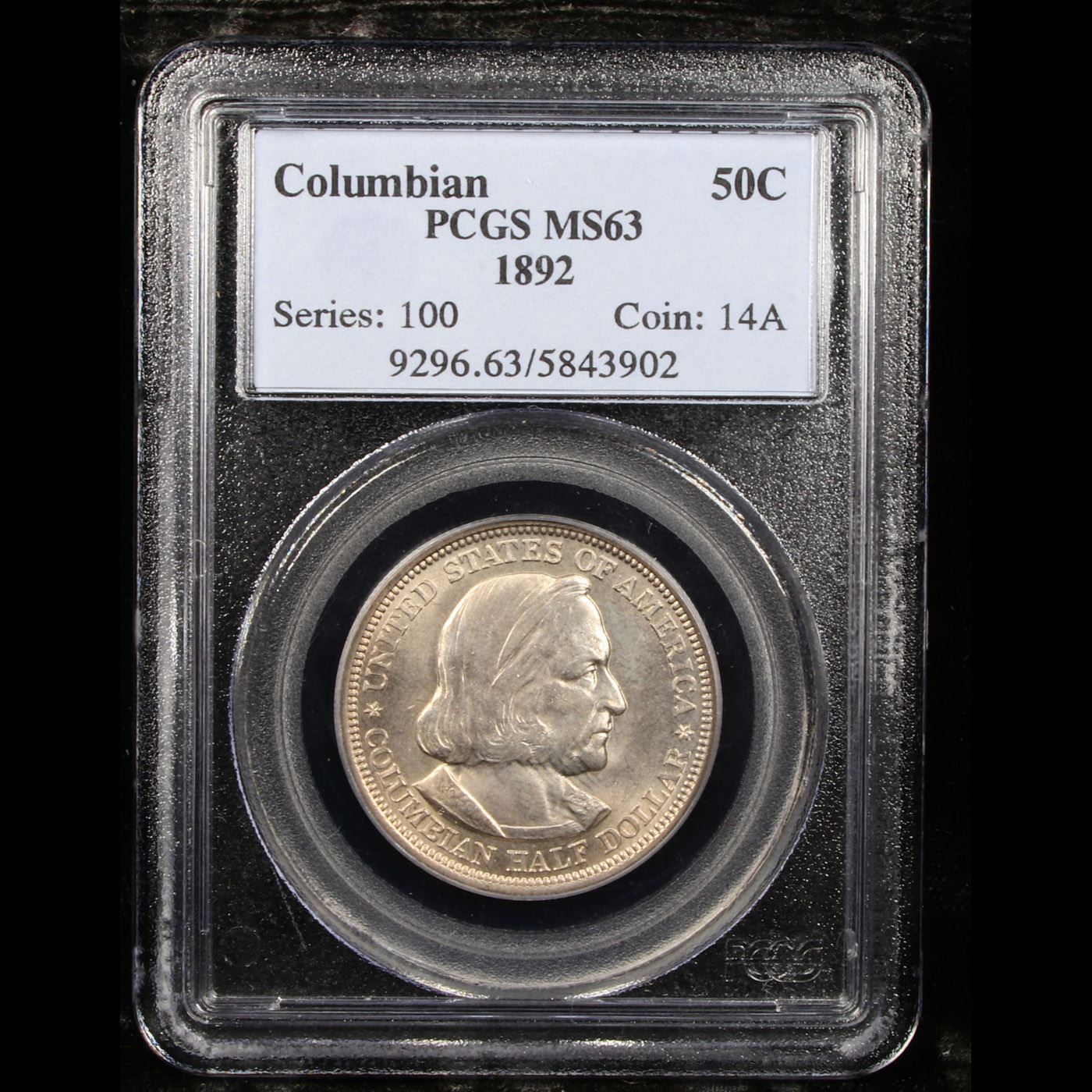 PCGS 1892 Columbian Old Commem Half Dollar 50c Graded ms63 By PCGS. The Columbus Half Dollar along with the Isabella Quarter were Minted in Honor of the 400th Anniversary of Columbus' Voyage to the New World. It was First Distributed at the Worlds Fair Honoring that Voyage. When Examining a Columbian Exposition Half Dollar, the First Points to Show Wear are Columbus’ Eyebrow, Cheek and the Hair Behind his Forehead and Jaw. On the Reverse, Check the Foresail and Sainsail, as well as the Right Side of the Eastern Hemisphere.