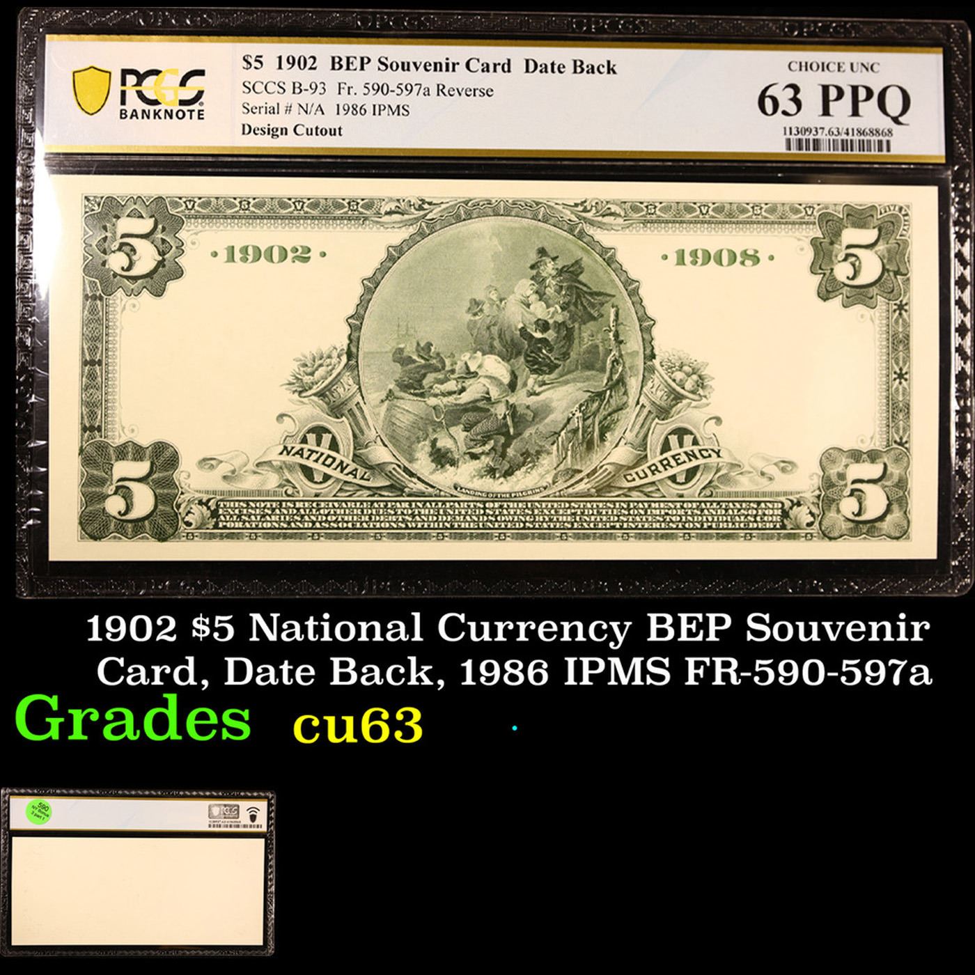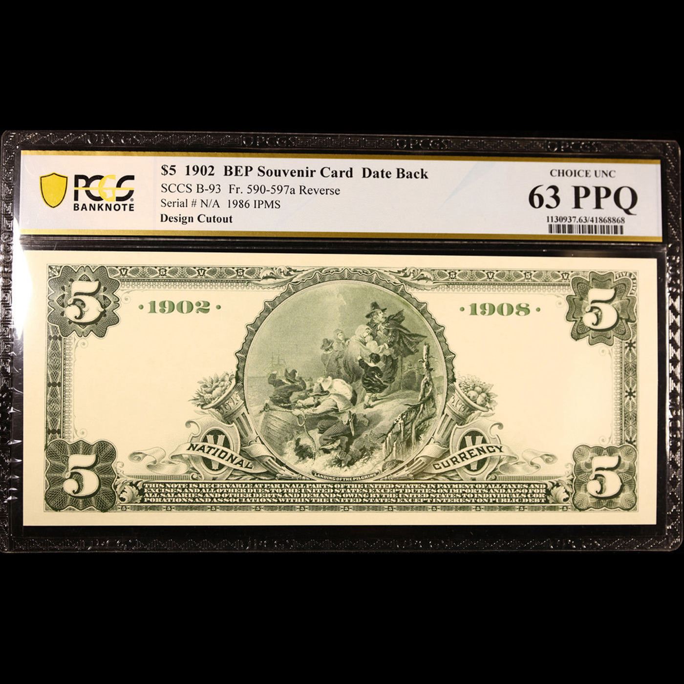 PCGS 1902 $5 National Currency BEP Souvenir Card, Date Back, 1986 IPMS FR-590-597a Graded cu63 By PCGS. Up for auction is a Bureau of Engraving and Printing (BEP) Proof Print . It is printed using the original Plates from the Bureau of Engraving and Printings archives. It was printed on two separate strikes, for the front and the back. It lacks serial numbers, but otherwise is a perfect proof of the Incredibly rare Piece of Currency