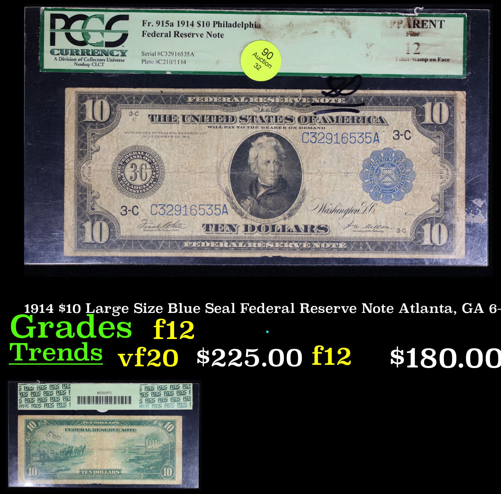 PCGS 1914 $10 Large Size Blue Seal Federal Reserve Note Atlanta, GA 6-F Graded f12 By PCGS