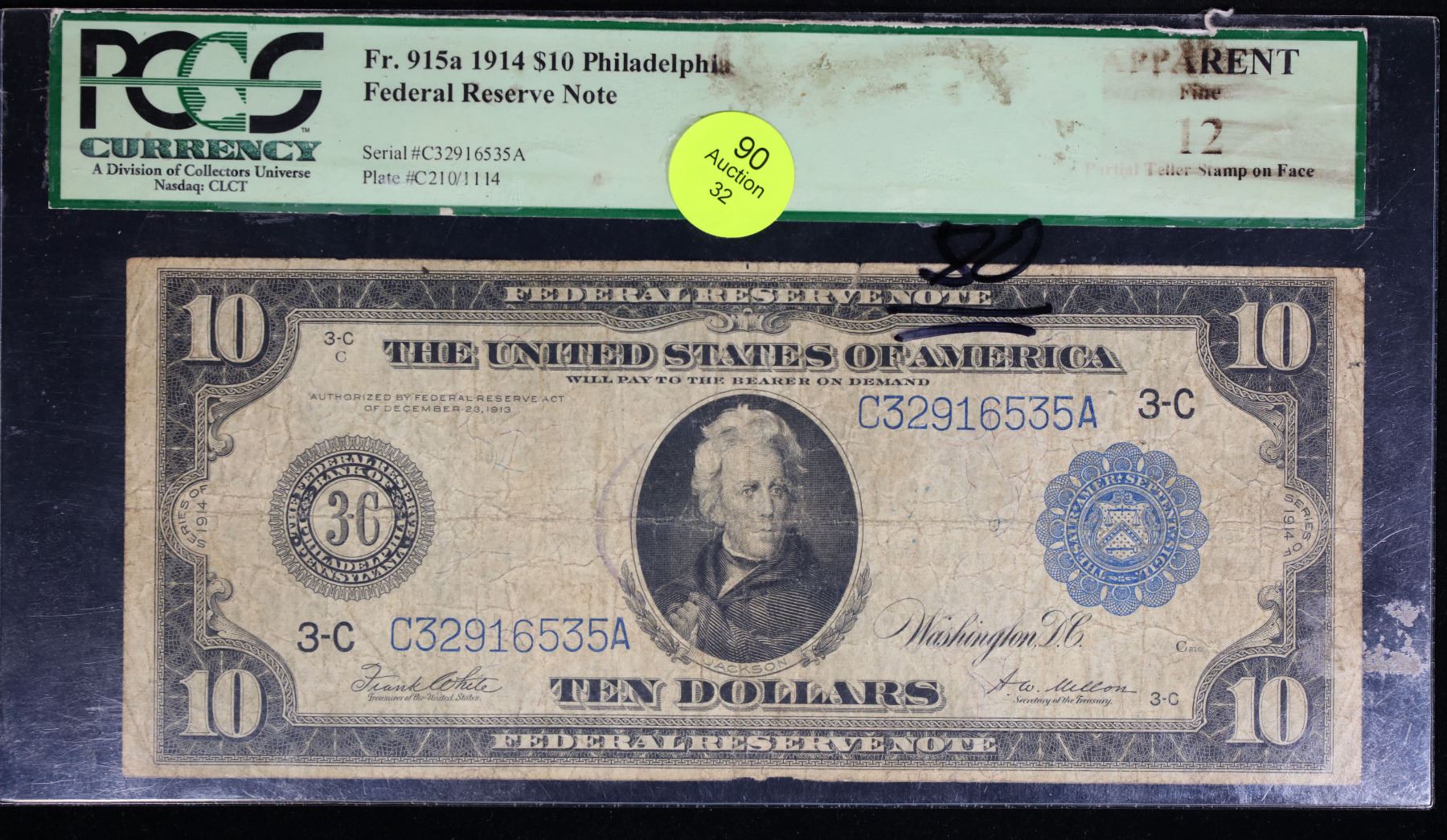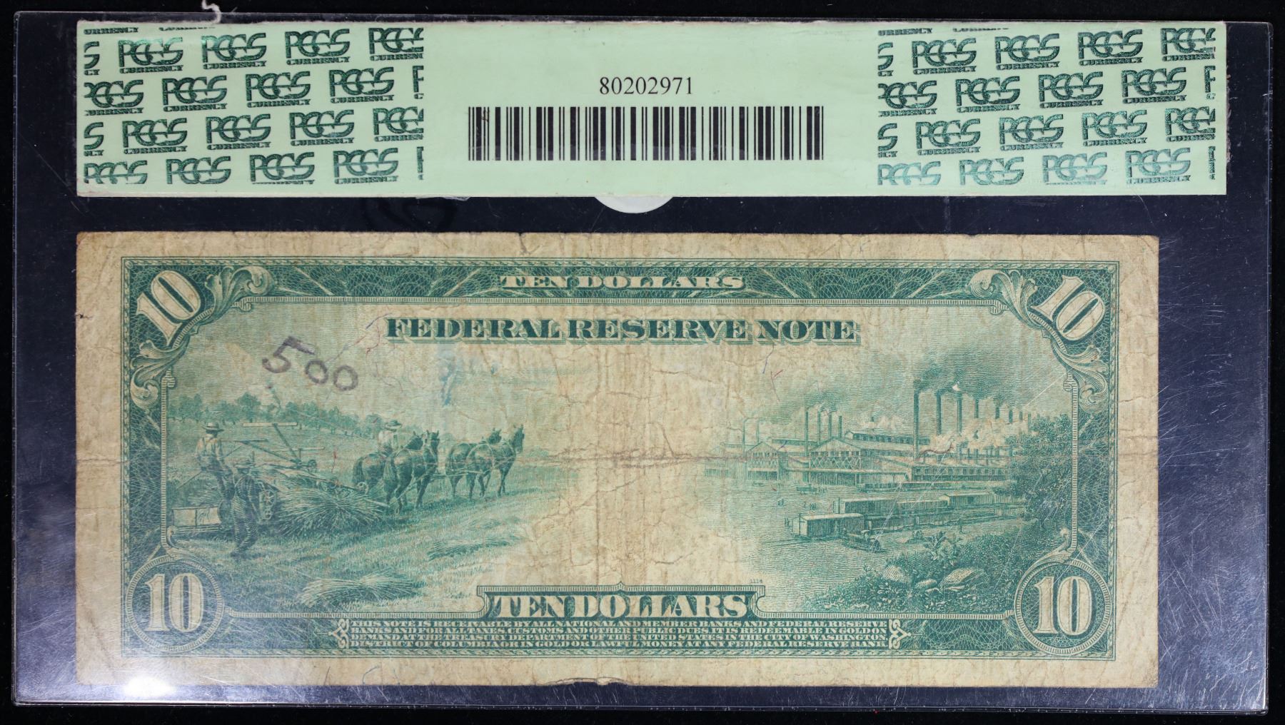 PCGS 1914 $10 Large Size Blue Seal Federal Reserve Note Atlanta, GA 6-F Graded f12 By PCGS. Despite having 1913 written on them, these are actually from the series of 1914, as it says on the right and left hands side of each note. An engraved portrait of President Andrew Jackson is on the note's face and the back features two vignettes titled Farming and Industry