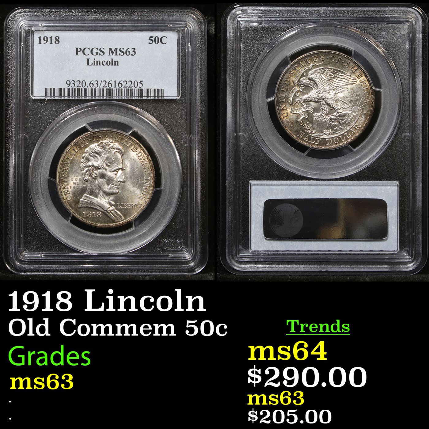 PCGS 1918 Lincoln Old Commem Half Dollar 50c Graded ms63 By PCGS. It is Interesting to note that the Portrait of Lincoln on the Obverse shows him Without a Beard as he appeared when he was in Illinois! The Obverse was Designed by George Morgan and the Reverse was One of John Sinnock's First Designs. George Morgan was the Chief Engraver at the time of the US Mint and Sinnock would be his successor, so two U.S. Mint Directors Designed this Beautiful Commemorative! Points to check for wear include Lincoln’s Cheekbone, Jaw, Eyebrow and the Hair Above His Ear. On the Reverse, examine the Eagle’s Breast Feathers and the Grass Beneath its Left Claw.