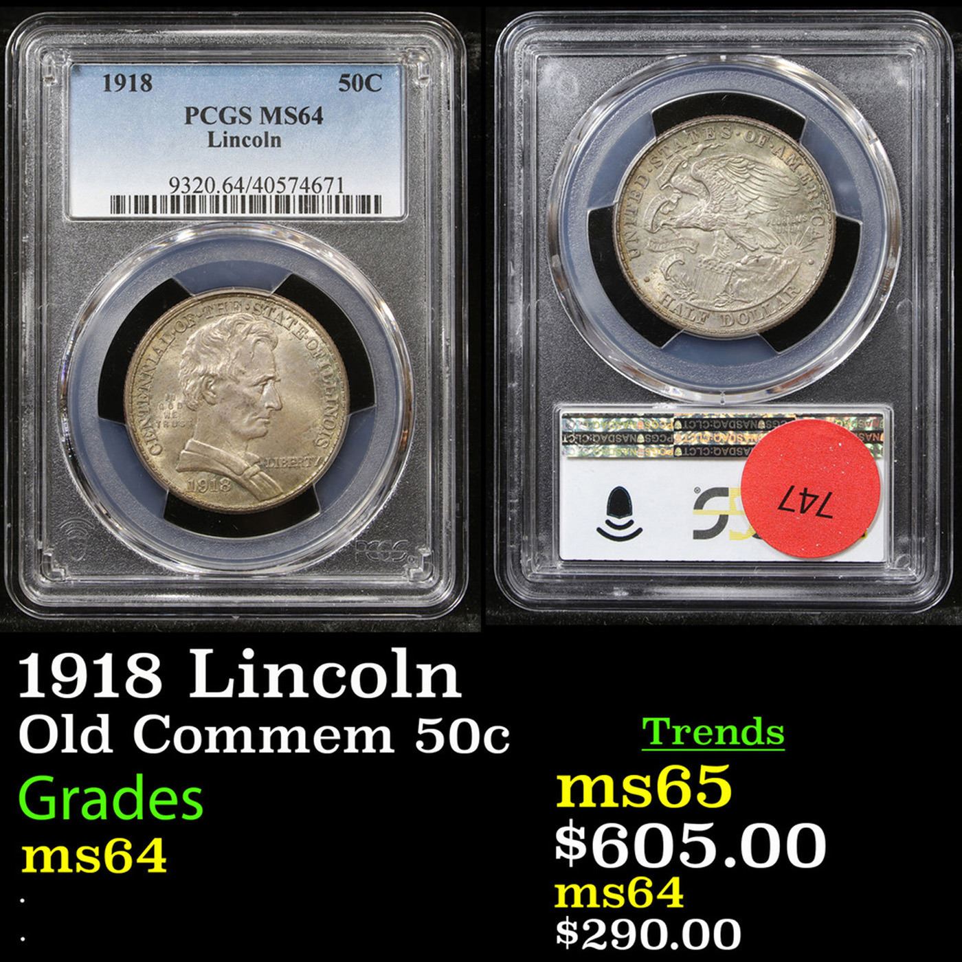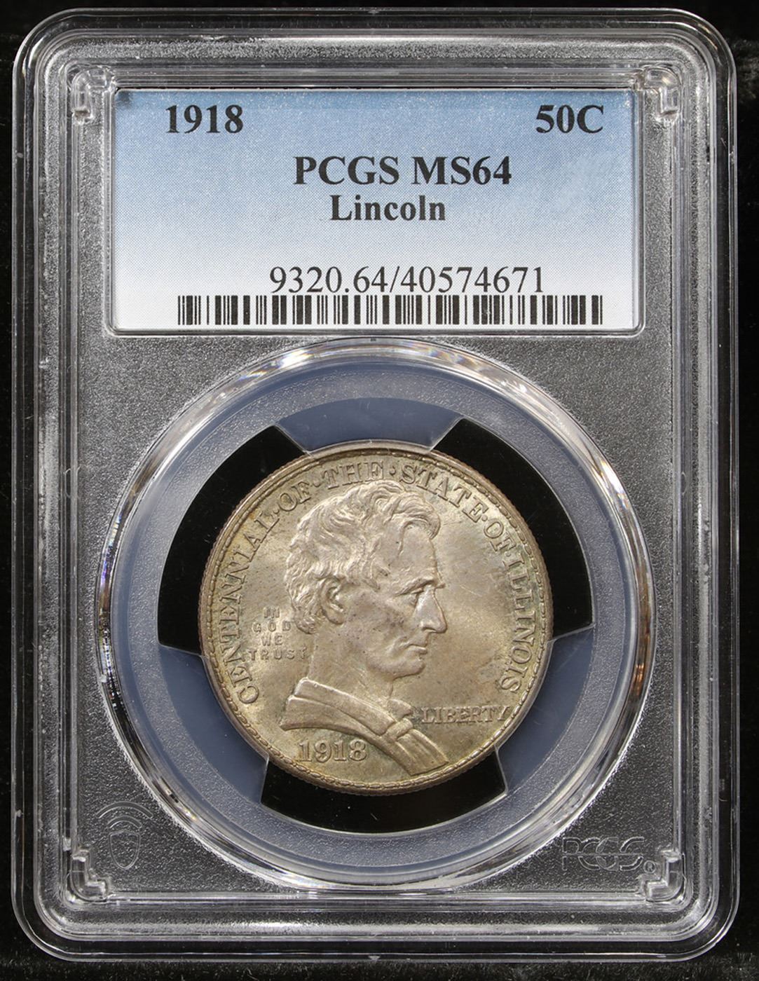 PCGS 1918 Lincoln Old Commem Half Dollar 50c Graded ms64 By PCGS. It is Interesting to note that the Portrait of Lincoln on the Obverse shows him Without a Beard as he appeared when he was in Illinois! The Obverse was Designed by George Morgan and the Reverse was One of John Sinnock's First Designs. George Morgan was the Chief Engraver at the time of the US Mint and Sinnock would be his successor, so two U.S. Mint Directors Designed this Beautiful Commemorative! Points to check for wear include Lincoln’s Cheekbone, Jaw, Eyebrow and the Hair Above His Ear. On the Reverse, examine the Eagle’s Breast Feathers and the Grass Beneath its Left Claw.