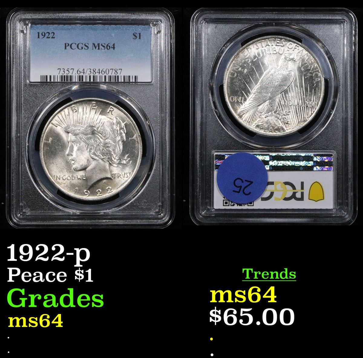 PCGS 1922-p Peace Dollar $1 Graded ms64 By PCGS.